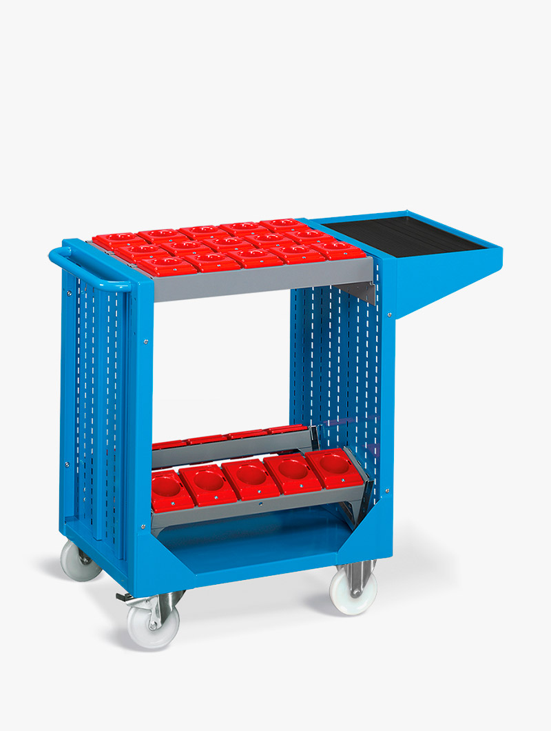 Organizado correctamente, un carro portaherramientas o un carro de almacén puede optimizar los tiempos de transporte de las herramientas o de la mercancía, incluso en grandes cantidades.