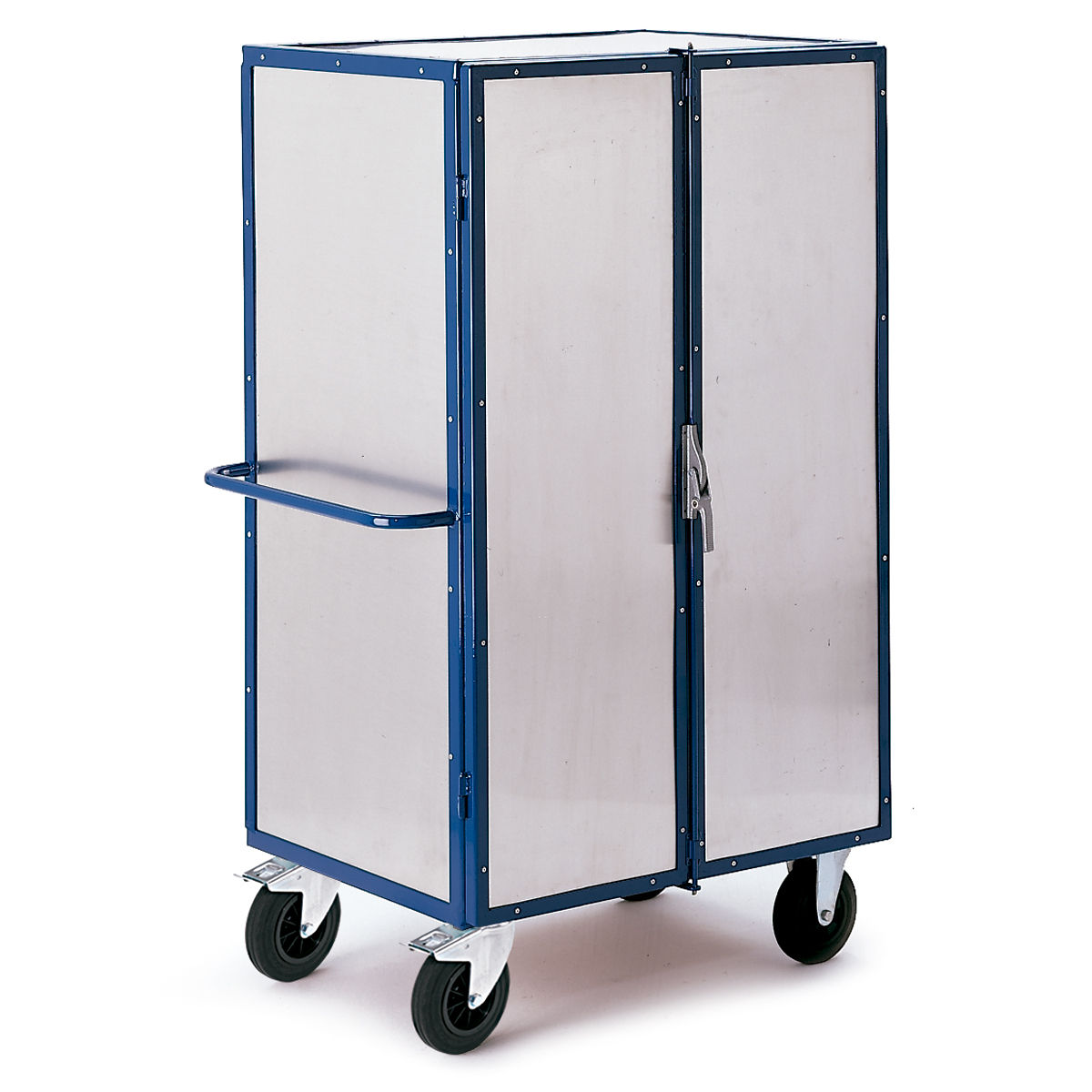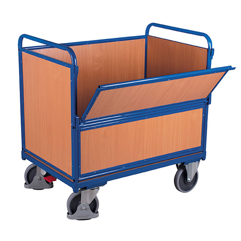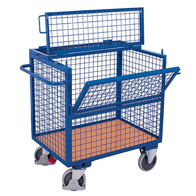 Carros con puerta lateral abatible y tapa disponibles en tres formatos diferentes: paredes rejadas de 50x50x4mm, paredes de madera o paredes metálicas. Dispone de una puerta lateral abatible que facilita las tareas de carga y descarga. Estructura completamente soldada. Estante base fabricados a partir de conglomerado de madera MDF de alta resistencia. Ruedas con recubrimiento de goma dura y sistema de giro con rodamientos. Estructura de acero galvanizado. Dispone de 2 ruedas fijas y 2 giratorias con freno de pie que bloquea a su vez el giro según norma EN1757-3. Se entrega montado.