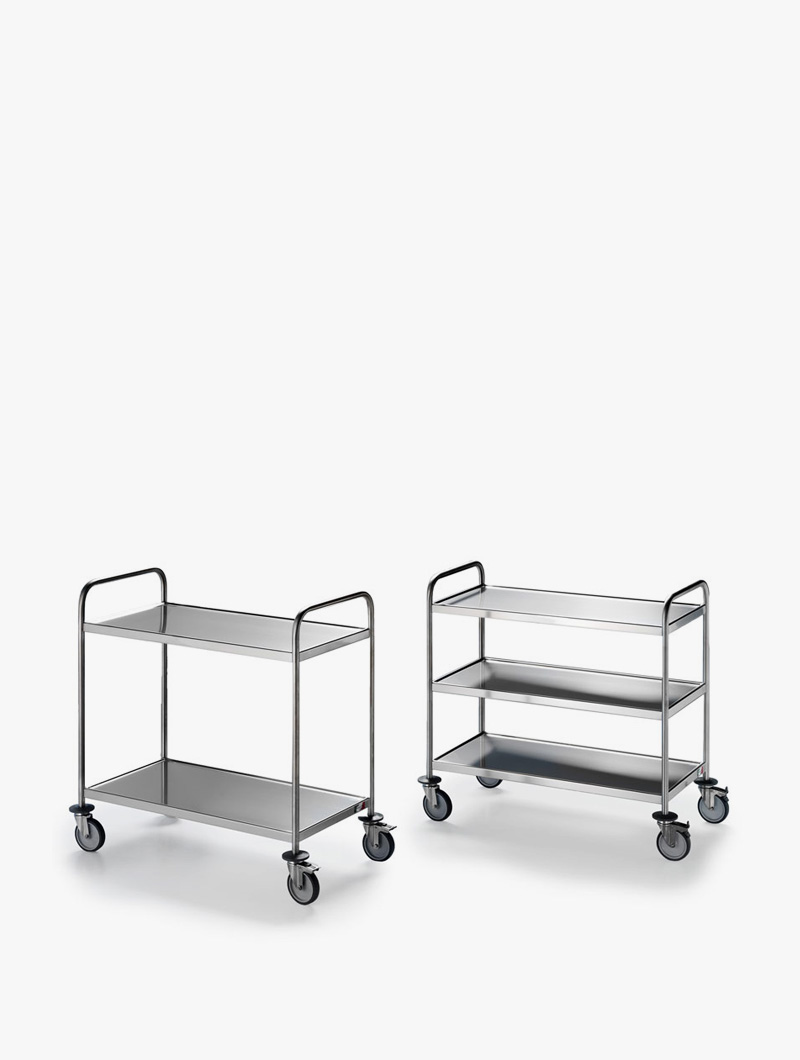 Fabricados en acero inoxidable AISI 304 18/10, ofrecen una excelente resistencia a la corrosión, gran durabilidad y una higiene óptima en todo tipo de ambientes. Cuentan con estructura tubular de Ø25 mm y están disponibles con uno o dos estantes, soldados o atornillados, adaptándose a diferentes necesidades de uso.