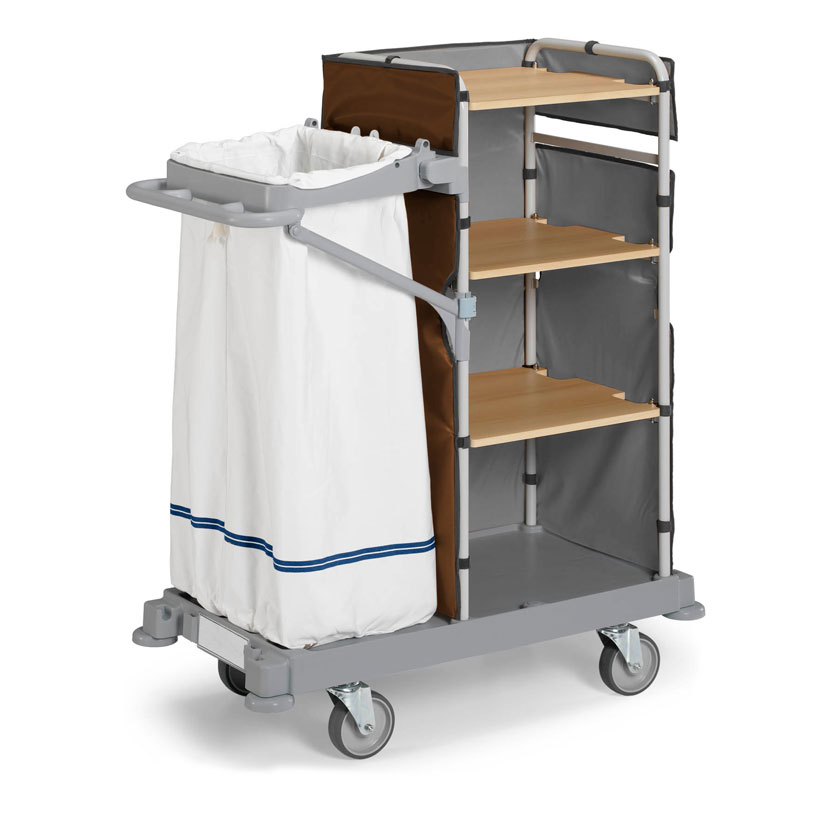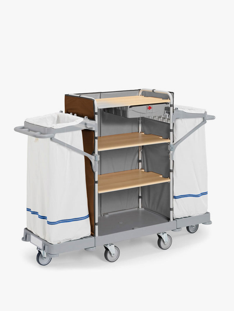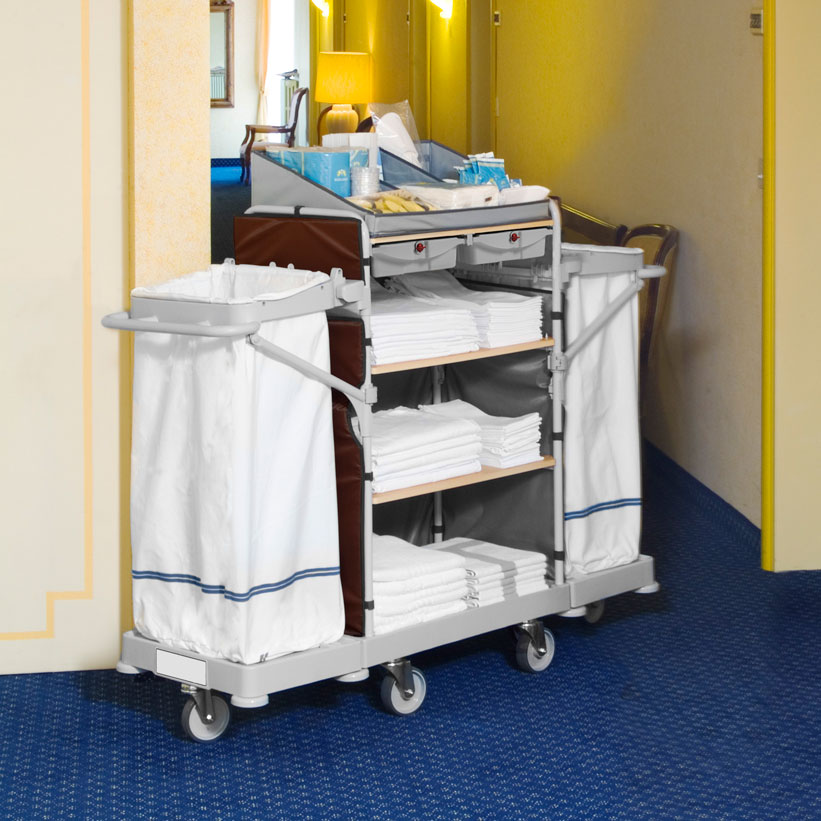 El carro puede equiparse con una amplia y completa gama de accesorios ideales para satisfacer cualquier necesidad de limpieza: se puede utilizar para el cambio de toallas y ropa de cama, para la recogida de toallas y ropa sucia, para la limpieza de habitaciones y baños y para la recogida de residuos.