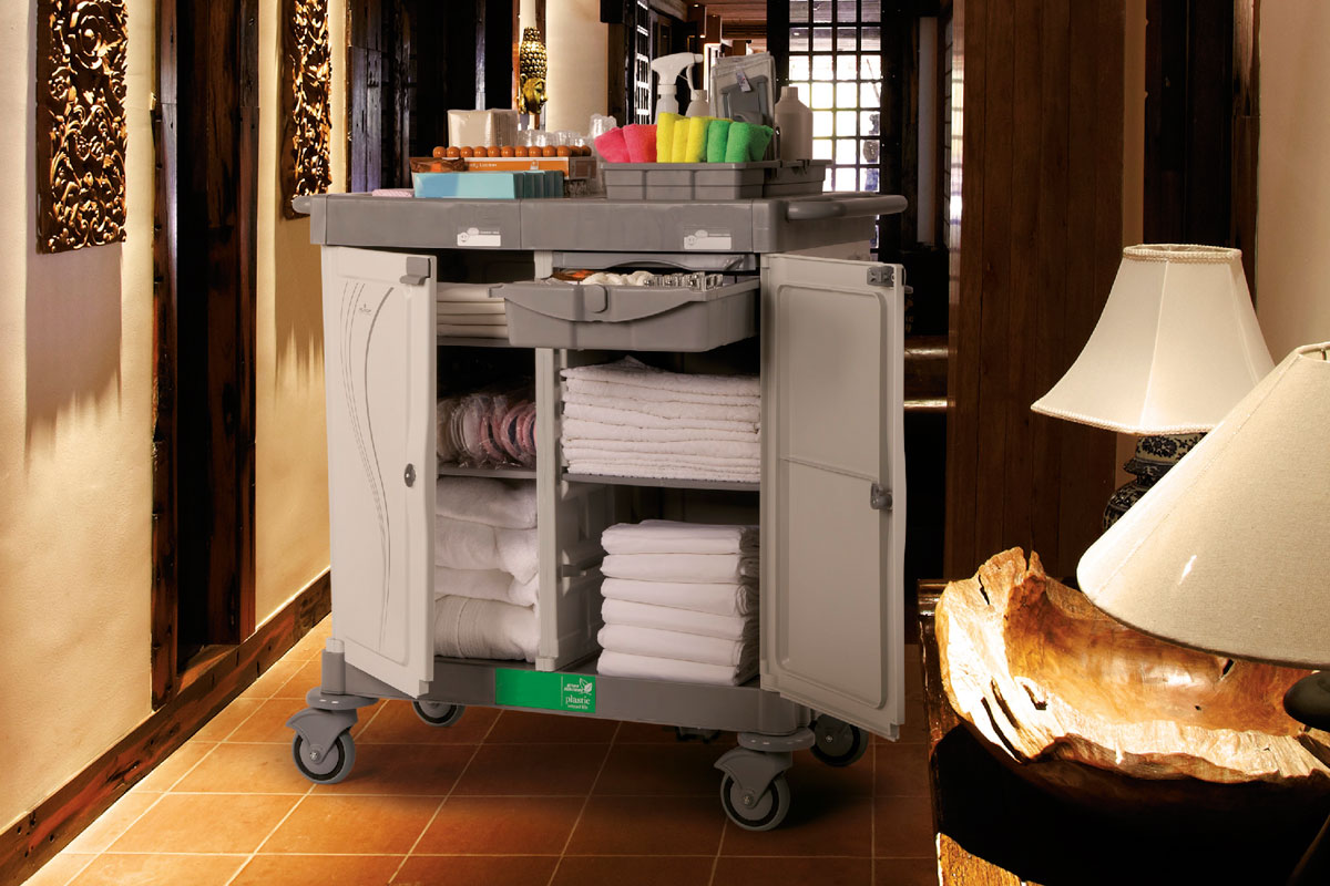Los carros para Hotel son sencillos y bien diseñados, gracias a sus colores se adaptan a cualquier ambiente. Sus componentes están hechos completamente de polipropileno, desde la base hasta los bastidores verticales, los estantes y todos los accesorios.