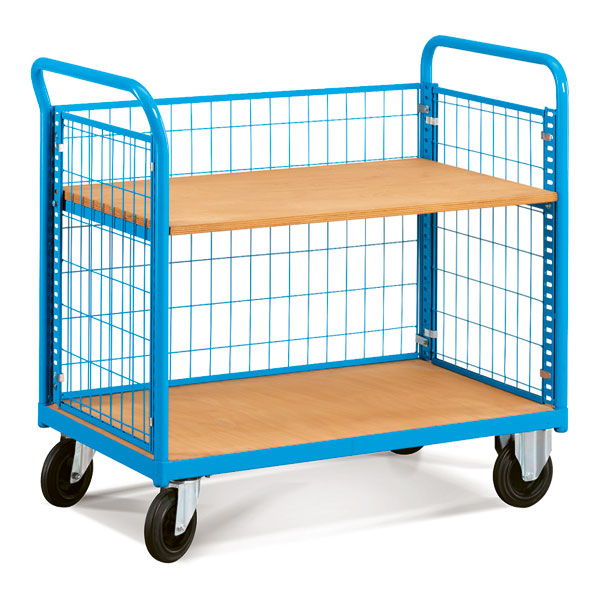 Carros de transporte con base de madera COMBI CF con estructura de perfil de acero de alta resistencia. Marco de estantes hechos a partir de perfil de acero en L. Estantes de madera y base metálica. Estructura desmontable para transporte y almacenamiento del carro. Múltiples configuraciones de estantes. Ruedas con recubrimiento de goma dura y sistema de giro con rodamientos. Estructura de acero galvanizado. Dispone de 2 ruedas fijas y 2 giratorias con freno de pie que bloquea a su vez el giro según norma EN1757-3. Se entrega desmontado.