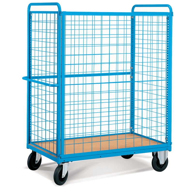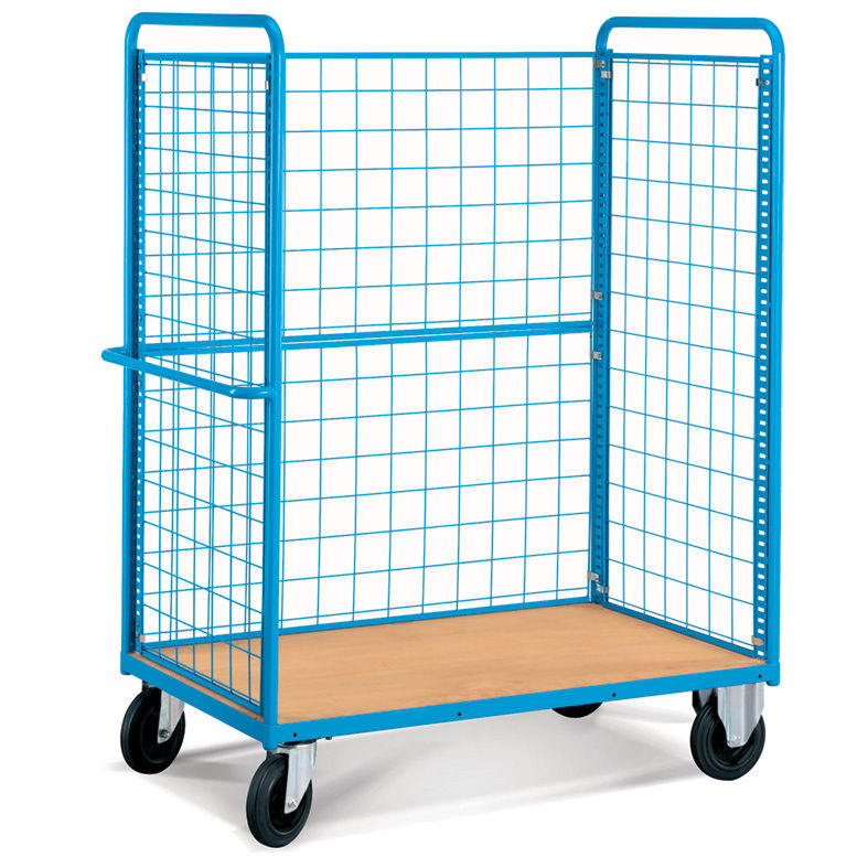 Carros de transporte con base de madera COMBI CK con estructura de perfil de acero de alta resistencia. Marco de estantes hechos a partir de perfil de acero en L. Estantes de madera y base metálica. Estructura desmontable para transporte y almacenamiento del carro. Múltiples configuraciones de estantes. Ruedas con recubrimiento de goma dura y sistema de giro con rodamientos. Estructura de acero galvanizado. Dispone de 2 ruedas fijas y 2 giratorias con freno de pie que bloquea a su vez el giro según norma EN1757-3. Se entrega desmontado.