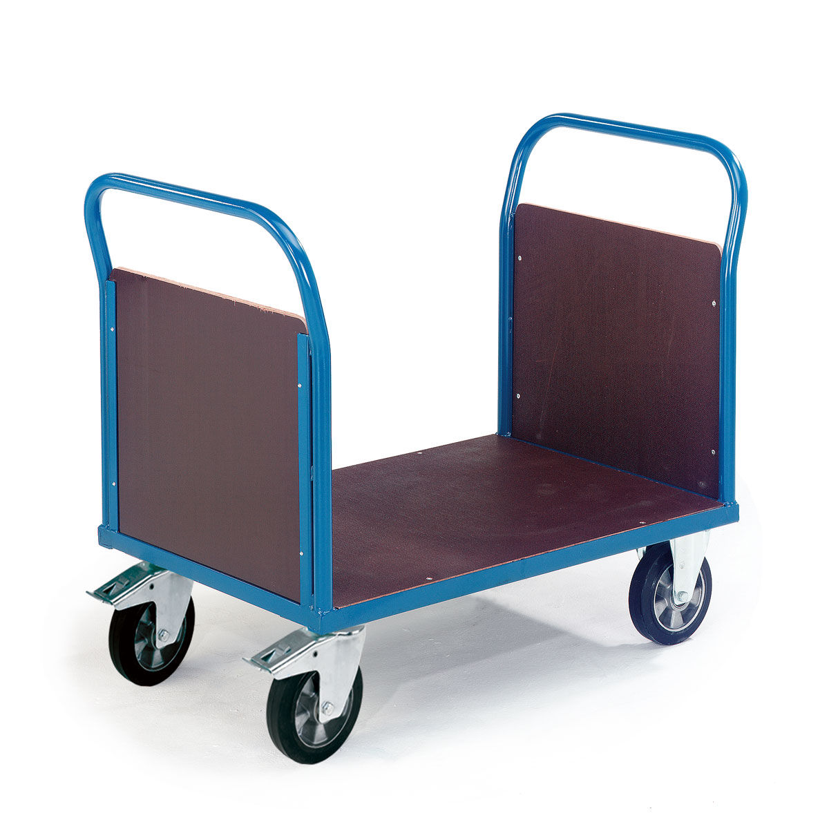 Carros de transporte con base y paredes de madera para 1000kg con estructura base hecha a partir de perfil de acero en L. Paredes y timón hechos a partir de tubo de acero pintado de diámetro 33,7mm y espesor 2mm. Estructura completamente soldada. Estante base y paredes fabricadas a partir de conglomerado de madera MDF de alta resistencia con superficie antideslizante y resistente a los agentes climatológicos. Paredes de altura 500mm. Ruedas con recubrimiento de goma dura y sistema de giro con rodamientos. Estructura de acero galvanizado. Dispone de 2 ruedas fijas y 2 giratorias con freno de pie que bloquea a su vez el giro según norma EN1757-3. El proceso de fabricación incluye el pintado de alta calidad con polvo poliéster y secado al horno. Se entrega montado.