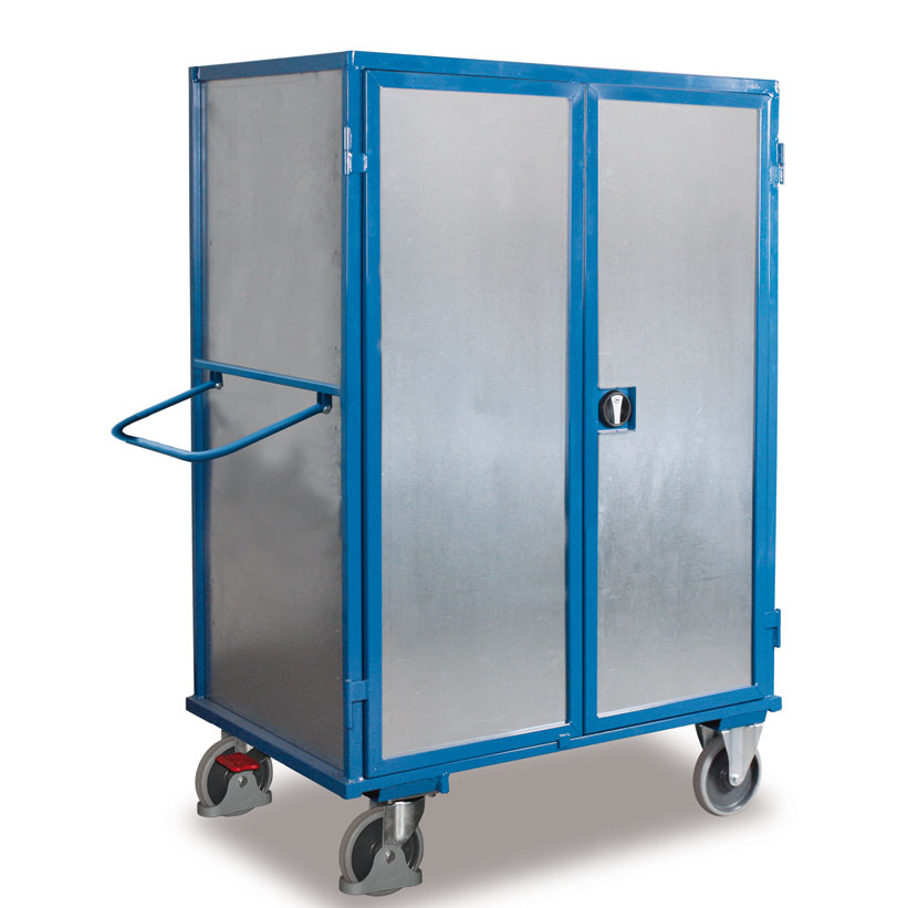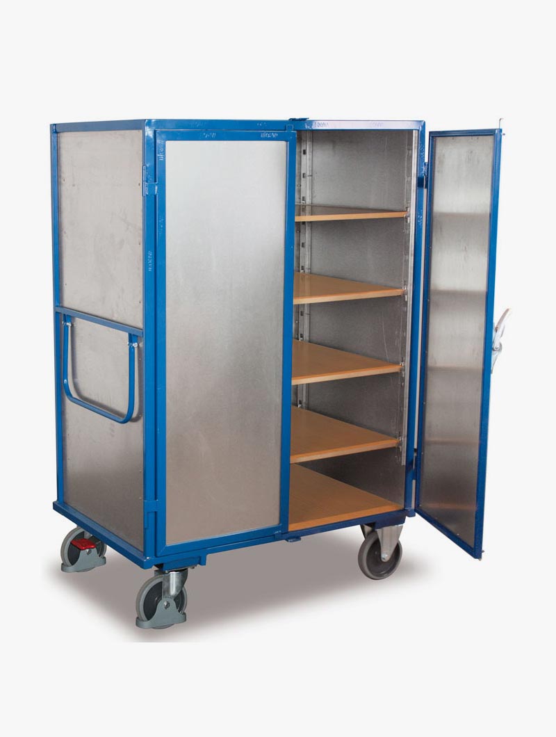 Carros de transporte de seguridad con plancha de acero electrocincada que gracias a la posibilidad de instalación de puertas batientes, pueden ser usados para mantener a buen recaudo cualquier tipo de artículo. Paredes de plancha de acero soldadas a la estructura. Disponible con maneta de cierre o con cerradura de cilindro con llave. Estantes fabricados a partir de conglomerado de madera MDF de alta resistencia con acabado en haya natural. Regulables en altura con soportes cada 100mm. Estructura completamente soldada. Dispone de 2 ruedas fijas y 2 giratorias con freno de pie que bloquea a su vez el giro según norma EN1757-3. Sistema de freno de fácil acceso que bloquea ambas ruedas móviles con un solo pedal. Se entrega montado.