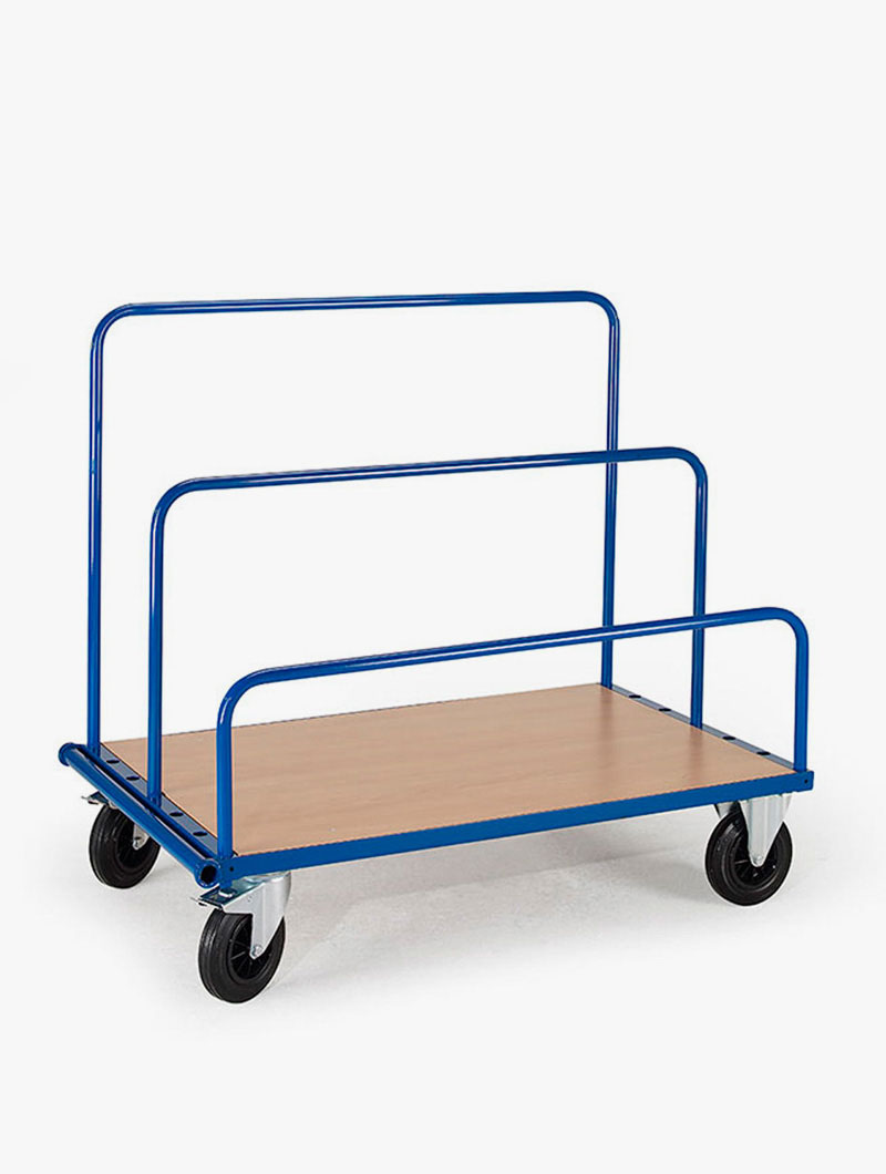 Carros de transporte desmontables para planchas diseñado especialmente para el transporte de placas y elementos de gran superficie. Soportes extraíbles y con 7 posiciones diferentes. Alturas de 300mm, 600mm y 900mm. Estructura completamente soldada. Estante base fabricado a partir de conglomerado de madera MDF de alta resistencia. Ruedas con recubrimiento de goma dura y sistema de giro con rodamientos. Estructura de acero galvanizado. Dispone de 2 ruedas fijas y 2 giratorias con freno de pie que bloquea a su vez el giro según norma EN1757-3.