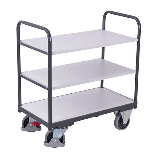 Carros especialmente pensado para transportar elementos que requieren de una protección electroestática. La posible carga estática se elimina mediante las ruedas. Estructura completamente soldada. Estantes fabricados a partir de conglomerado de madera MDF de alta resistencia. Ruedas con recubrimiento de goma conductora y sistema de giro con rodamientos. Estructura de acero galvanizado. Dispone de 2 ruedas fijas y 2 giratorias con freno de pie que bloquea a su vez el giro según norma EN1757-3.