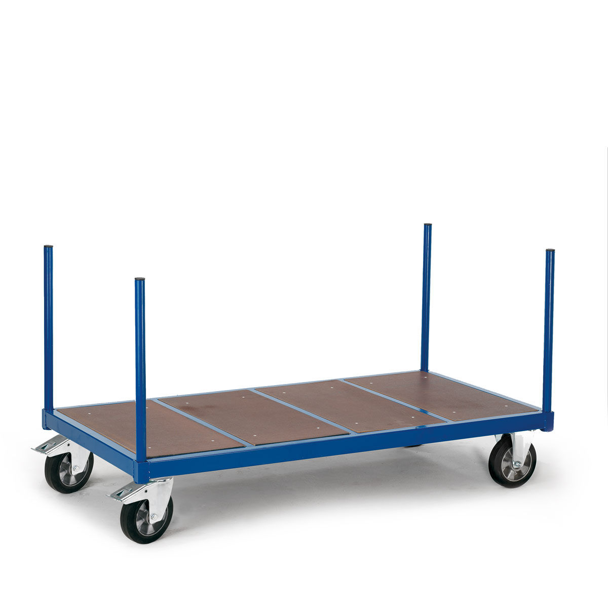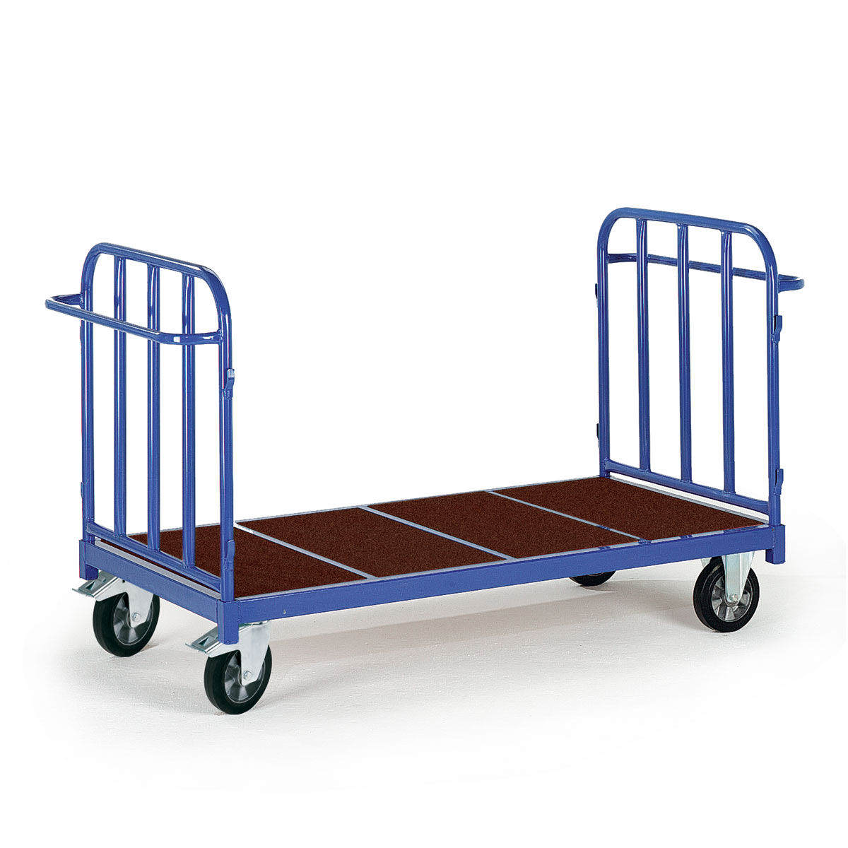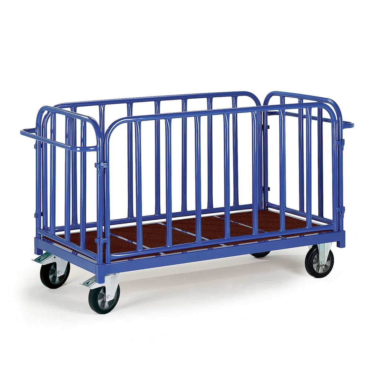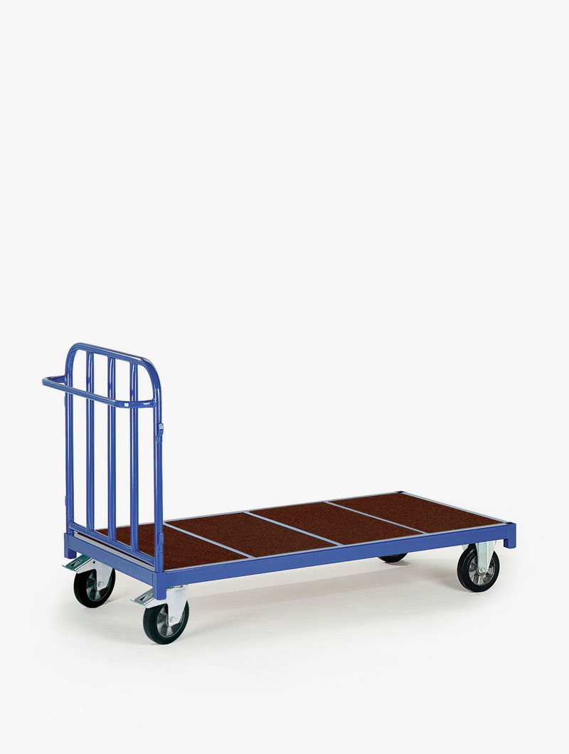Carros de transporte para 1200kg con estructura base hecha a partir de perfil de acero en L. Paredes y timón hechos a partir de tubo de acero pintado de diámetro 33,7mm y espesor 2mm. Estructura completamente soldada. Estante base y paredes fabricadas a partir de conglomerado de madera MDF de alta resistencia con superficie antideslizante y resistente a los agentes climatológicos. Paredes de altura 500mm. Ruedas con recubrimiento de goma dura y sistema de giro con rodamientos. Estructura de acero galvanizado. Dispone de 2 ruedas fijas y 2 giratorias con freno de pie que bloquea a su vez el giro según norma EN1757-3. El proceso de fabricación incluye el pintado de alta calidad con polvo poliéster y secado al horno. Se entrega montado.