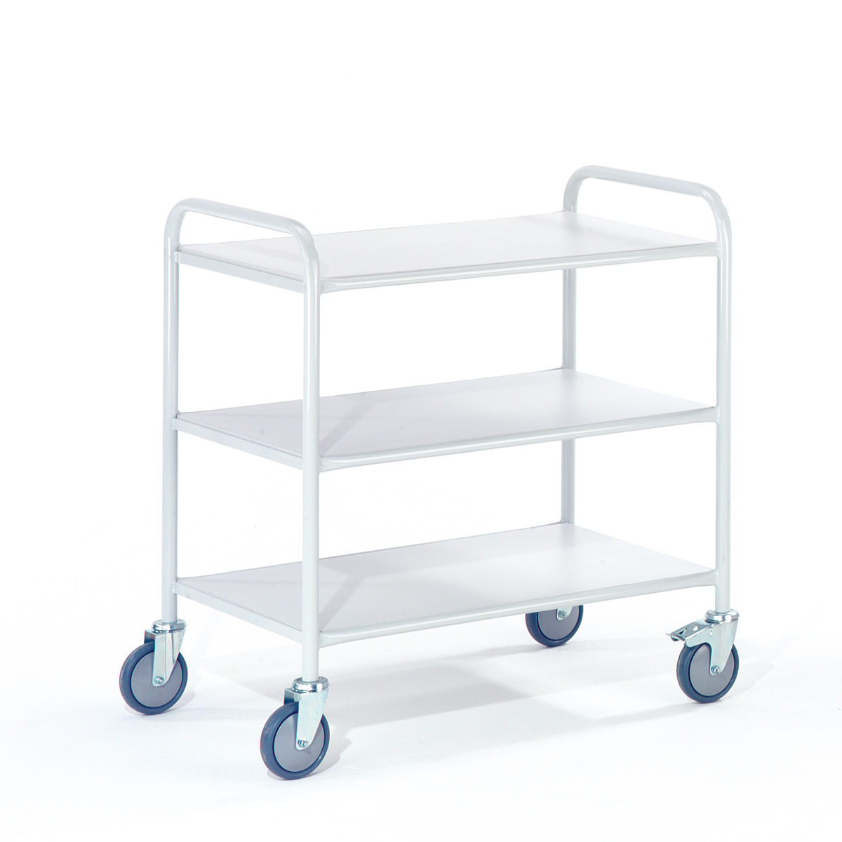 Ruedas con recubrimiento de goma y sistema de giro con rodamientos. Estructura de acero pintado.