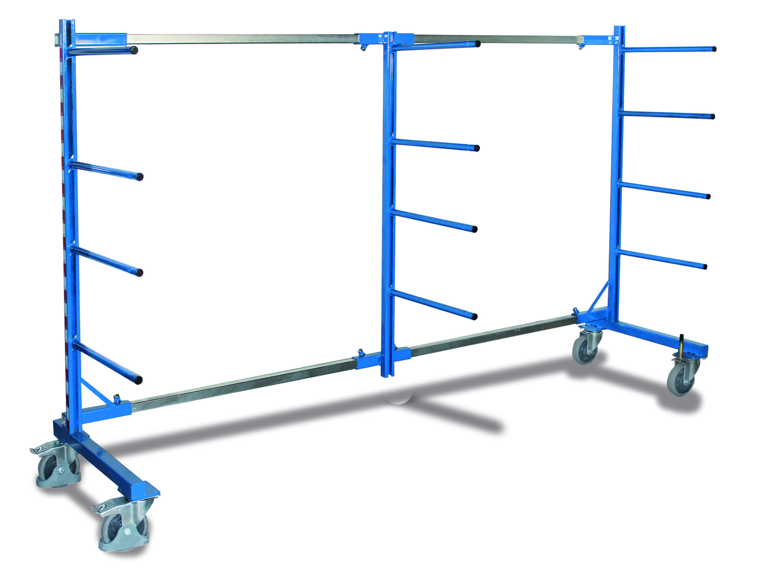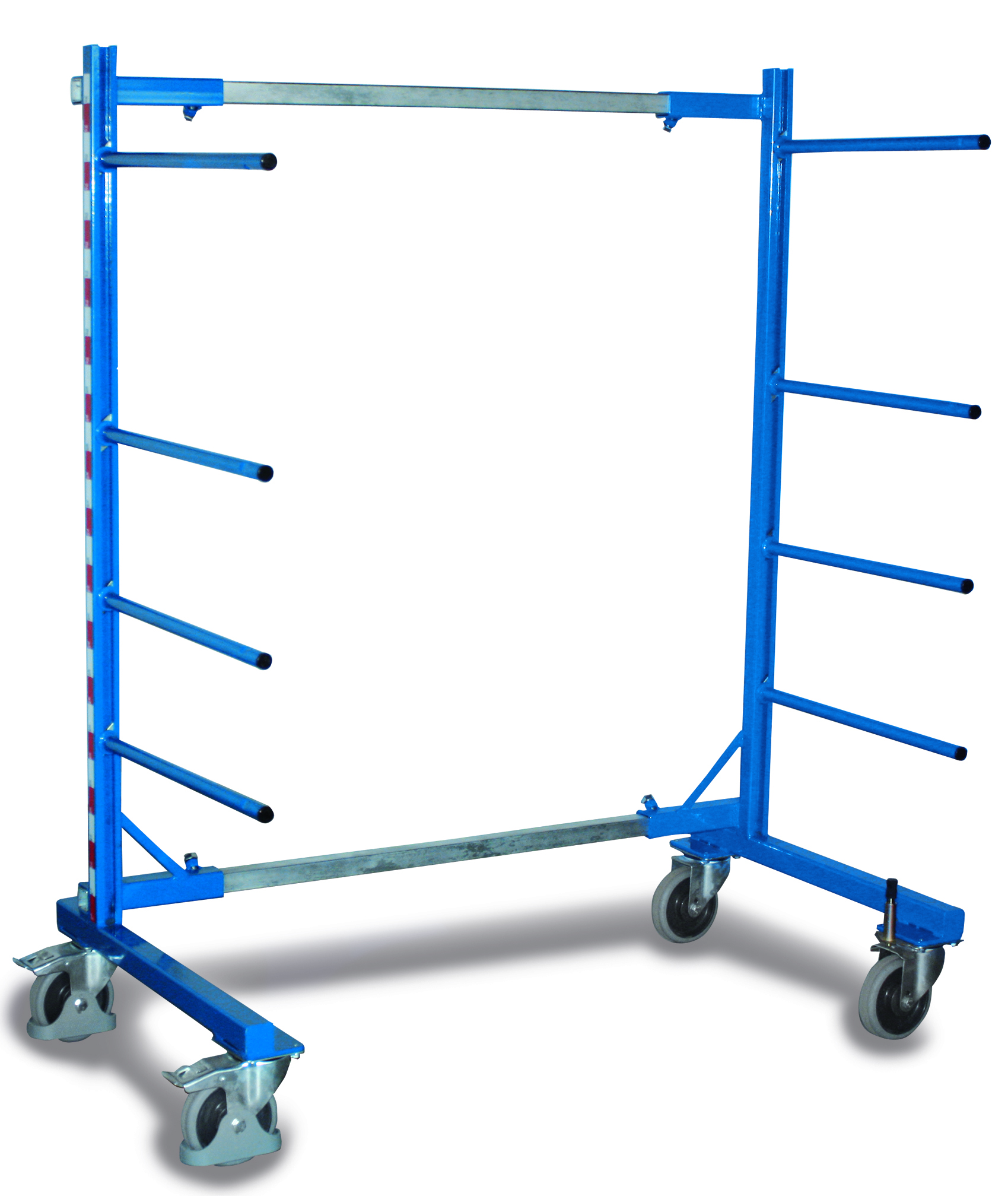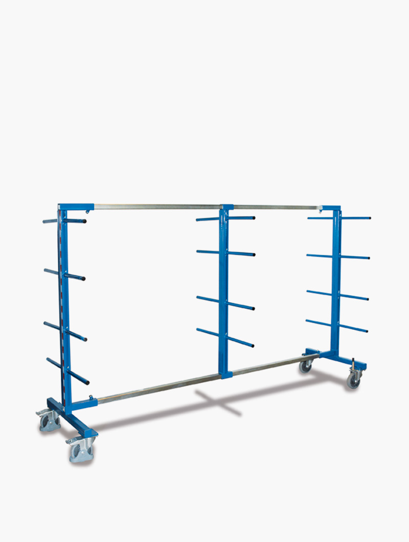 Carro con soportes para planchas de anchura y longitud regulables. Fabricado con perfiles de acero soldados y acabados con pintura en colores RAL.