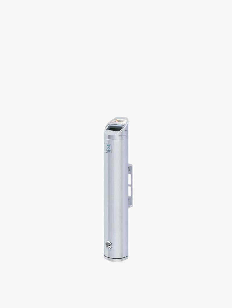 Cenicero con forma de tubo vertical. Estructura de aluminio cepillado. Vaciado mediante tapa hermética en la parte inferior, cerrada con llave triangular. La señalización y tornillería vienen suministradas.
