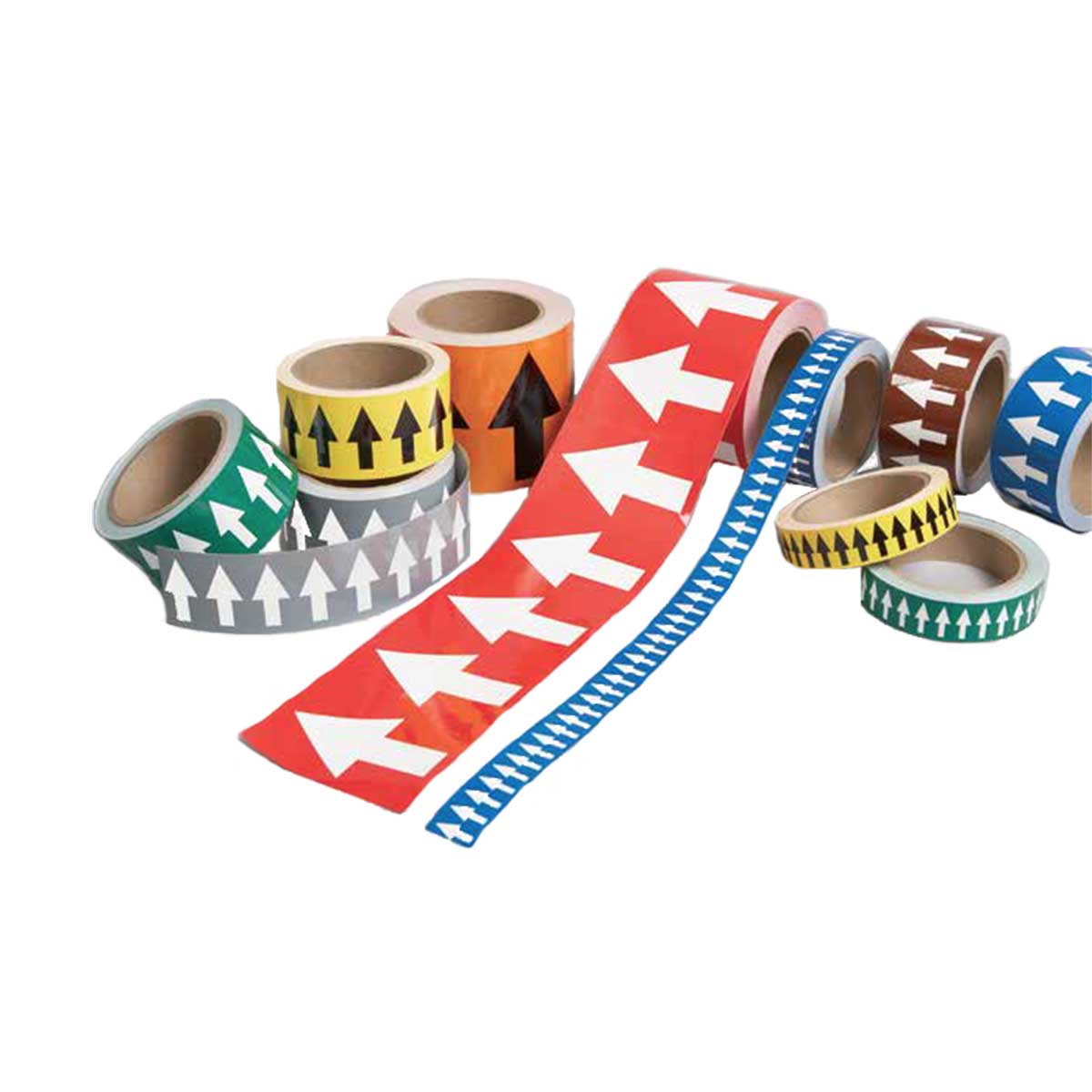 Cintas de marcaje de alta visibilidad para indicar direcciones de caudales y contenidos de las tuberías. Colores de alta visibilidad.