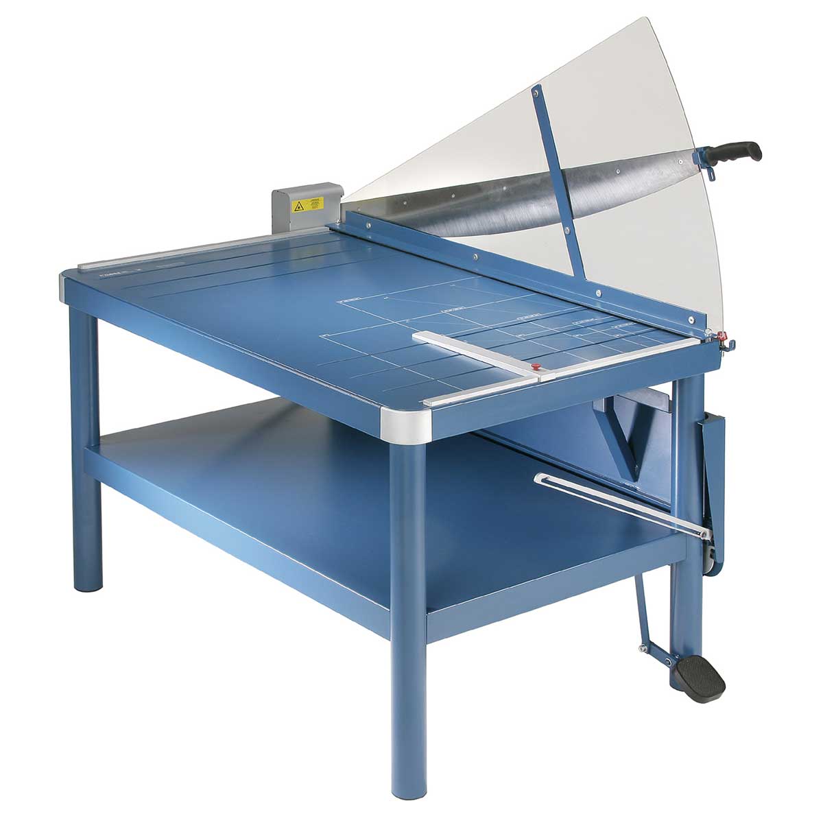 Mesas sólidas con esquinas redondeadas. Líneas de formatos DIN impresas en las mesas. Cuchilla superior de acero atornillada. Equipada con pedal de prensado para un prensado fácil y uniforme de grandes formatos. Topes regulables de metal mediante ranuras de guía. Estantes inferiores en todos los modelos. Consulte con nuestro departamento técnico.