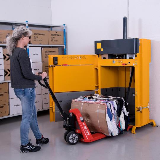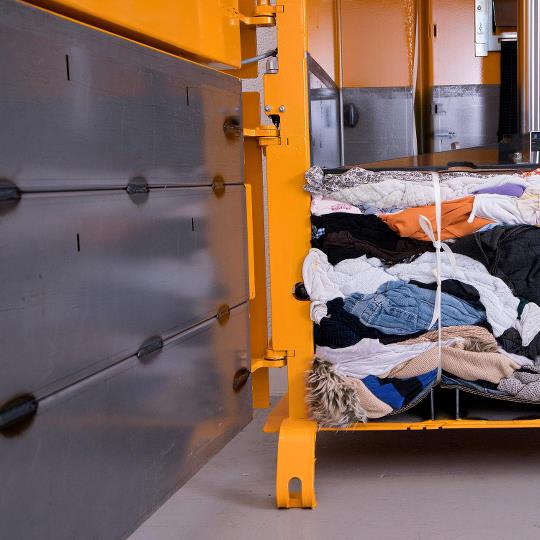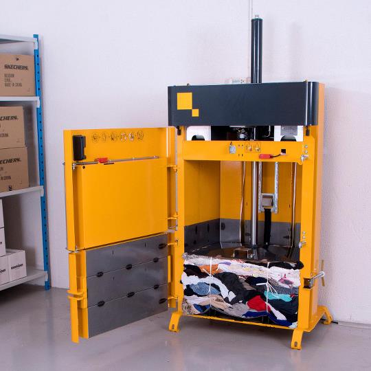 Compactadora para téxtil con una cámara diseñada para proteger la ropa de manchas y de posibles roturas. Esta compactadora hace pequeñas balas manejables que son fáciles de transportar y apilar en estanterías, ahorrando en desplazamiento.