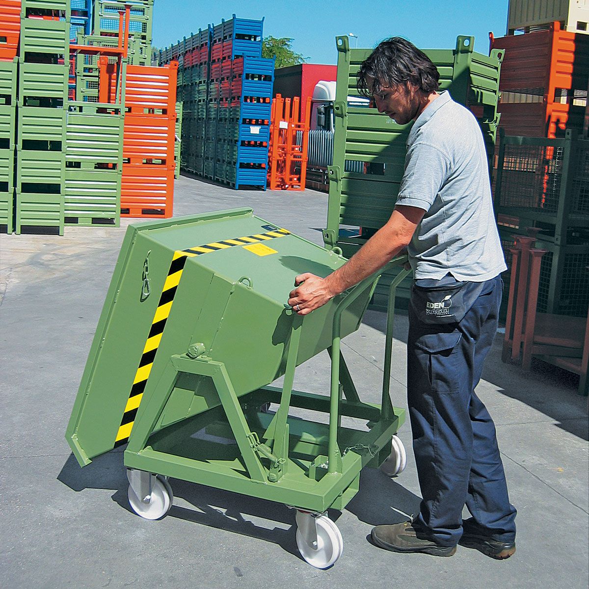 Con enganches para horquillas para realizar el vaciado de la carga mediante carretilla elevadora, o, gracias a su diseño, también puede realizar el vaciado el mismo operario desde el suelo.