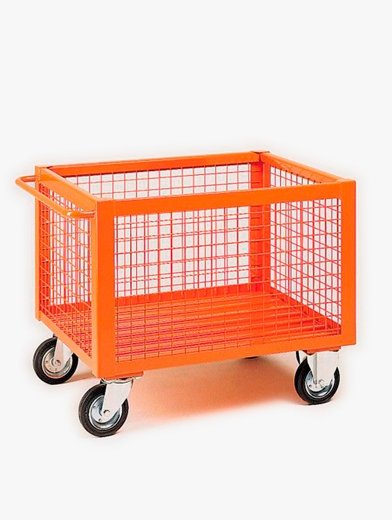 Contenedor con paredes de malla con ruedas y tirador
