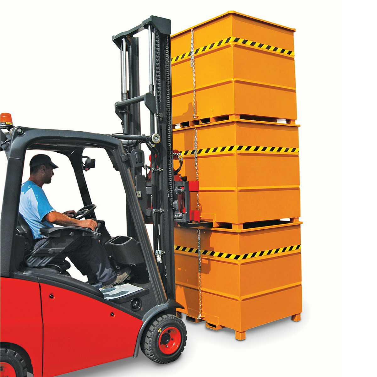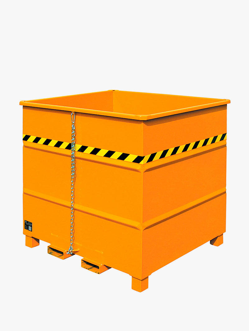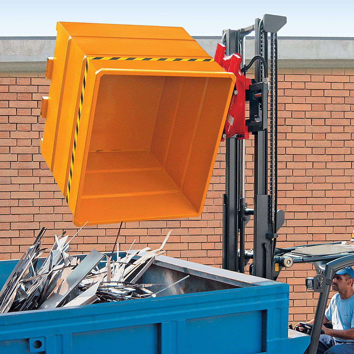 Contenedor de chapa metálica con patas adaptado para poder ser voltado desde un rotador de carretilla elevadora. Es una herramienta perfecta para poder descargar escombros o cualquier otro tipo de material de desecho en un gran contenedor de residuos o simplemente en el lugar deseado.