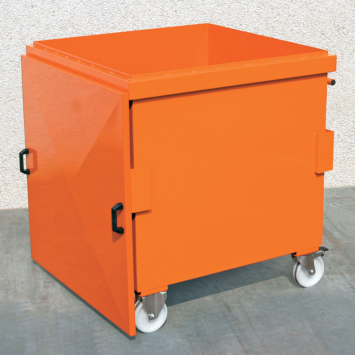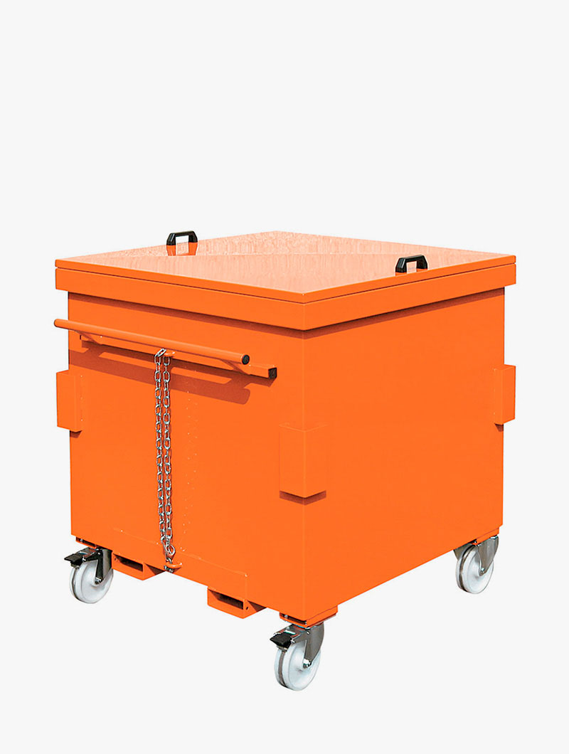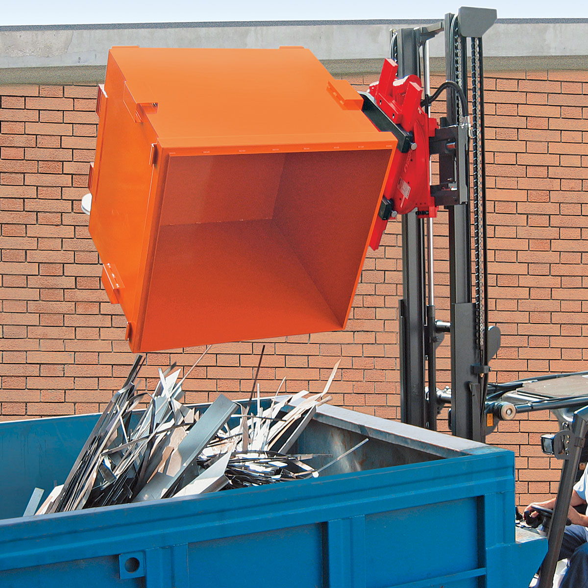 Contenedor de chapa metálica con ruedas y tapa adaptado para poder ser voltado desde un rotador de carretilla elevadora. Es una herramienta perfecta para poder descargar escombros o cualquier otro tipo de material de desecho en un gran contenedor de residuos o simplemente en el lugar deseado.