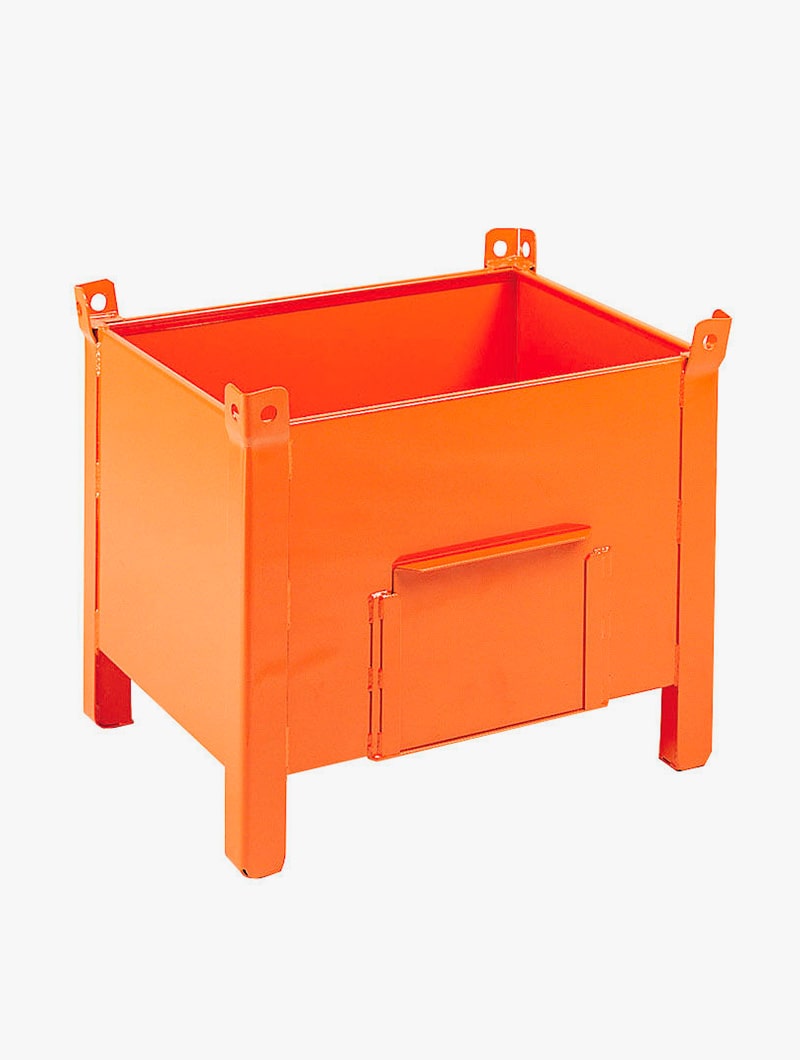 Contenedor de chapa lisa con fondo inclinadopara una posible evacuación de líquidos o piezas pequeñas, con patas.