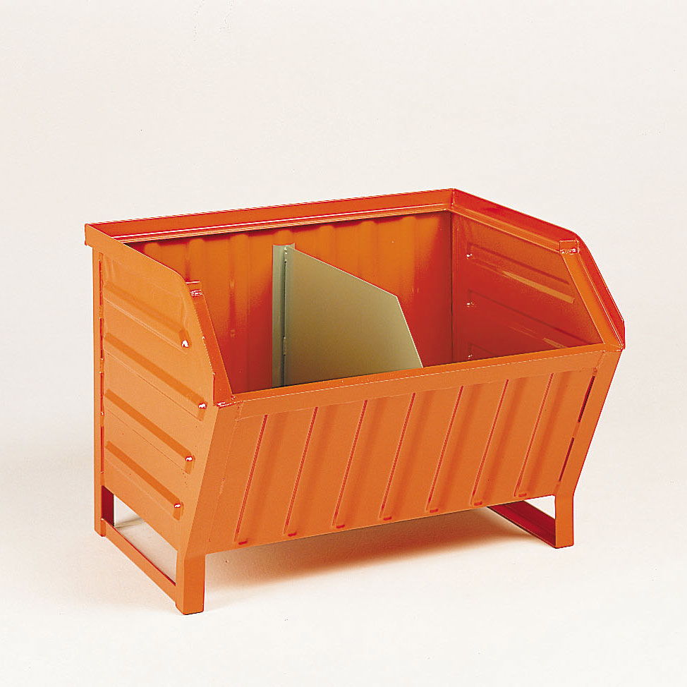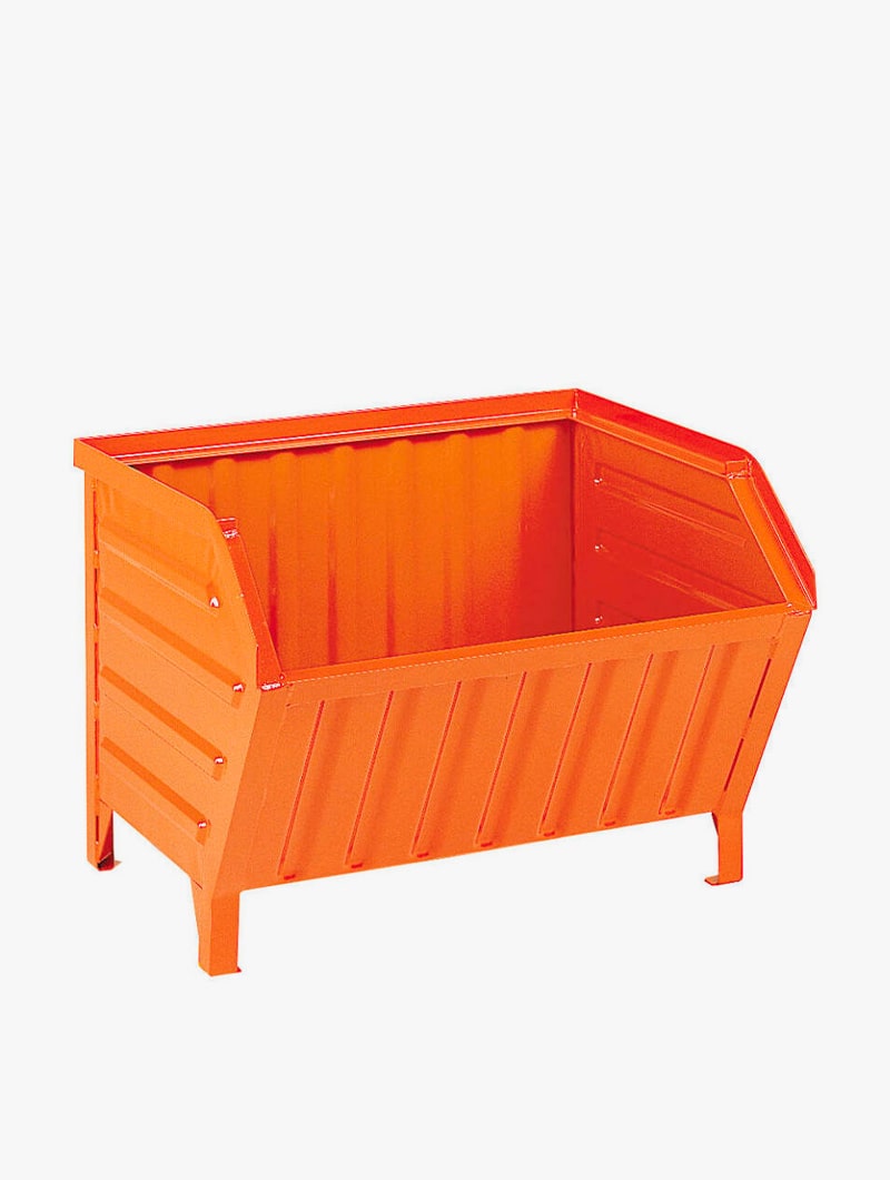 Contenedor de chapa no apilable con patas y frontal inclinado.