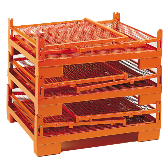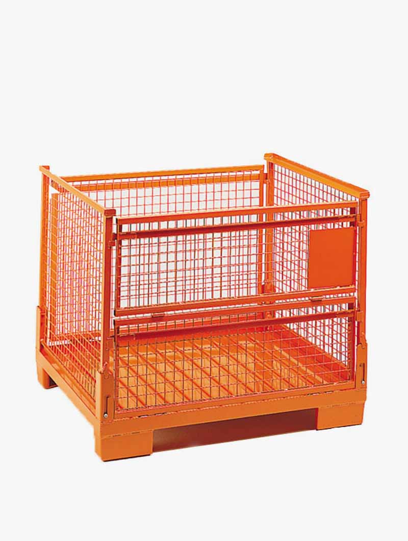 Contenedor plegable con puerta lateral, estructura de malla y fondo ondulado.