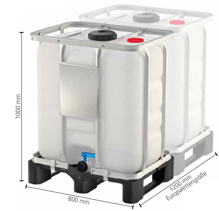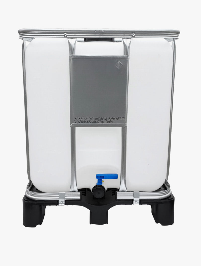 Contenedor de plástico IBC fabricado en HDPE resistente a los rayos UV, encapsulado por una marco perimetral de tubos de acero soldados. Es un contenedor robusto y reutilizable, ideal para el ahorro de espacio, de fácil uso en el transporte y almacenamiento de substancias líquidas. Es fácilmente manipulable con transpaleta o carretilla ya que la base está formada por un palet de plástico.