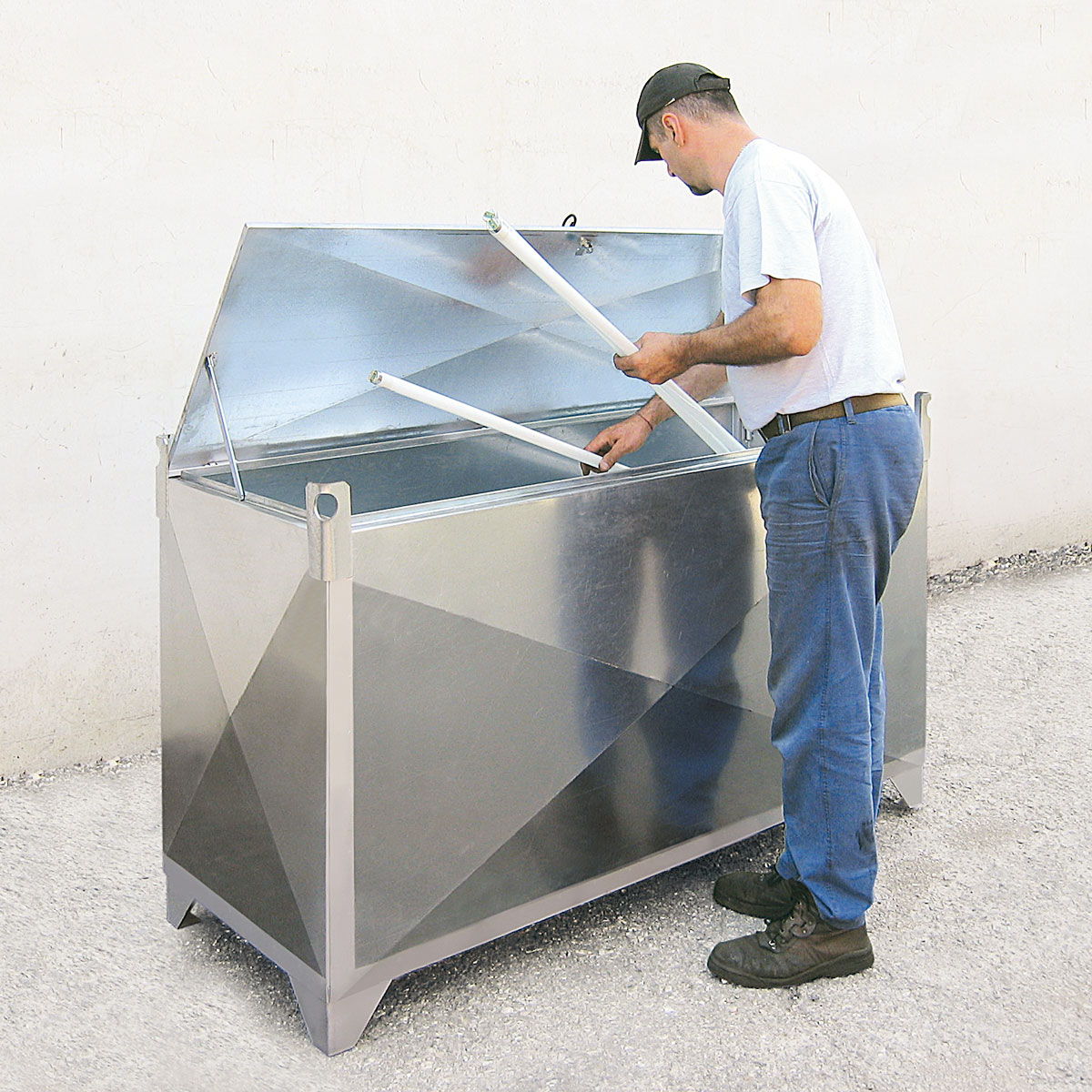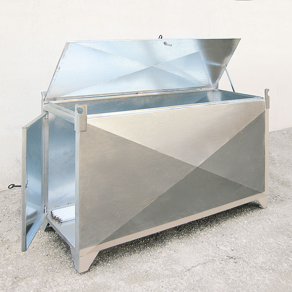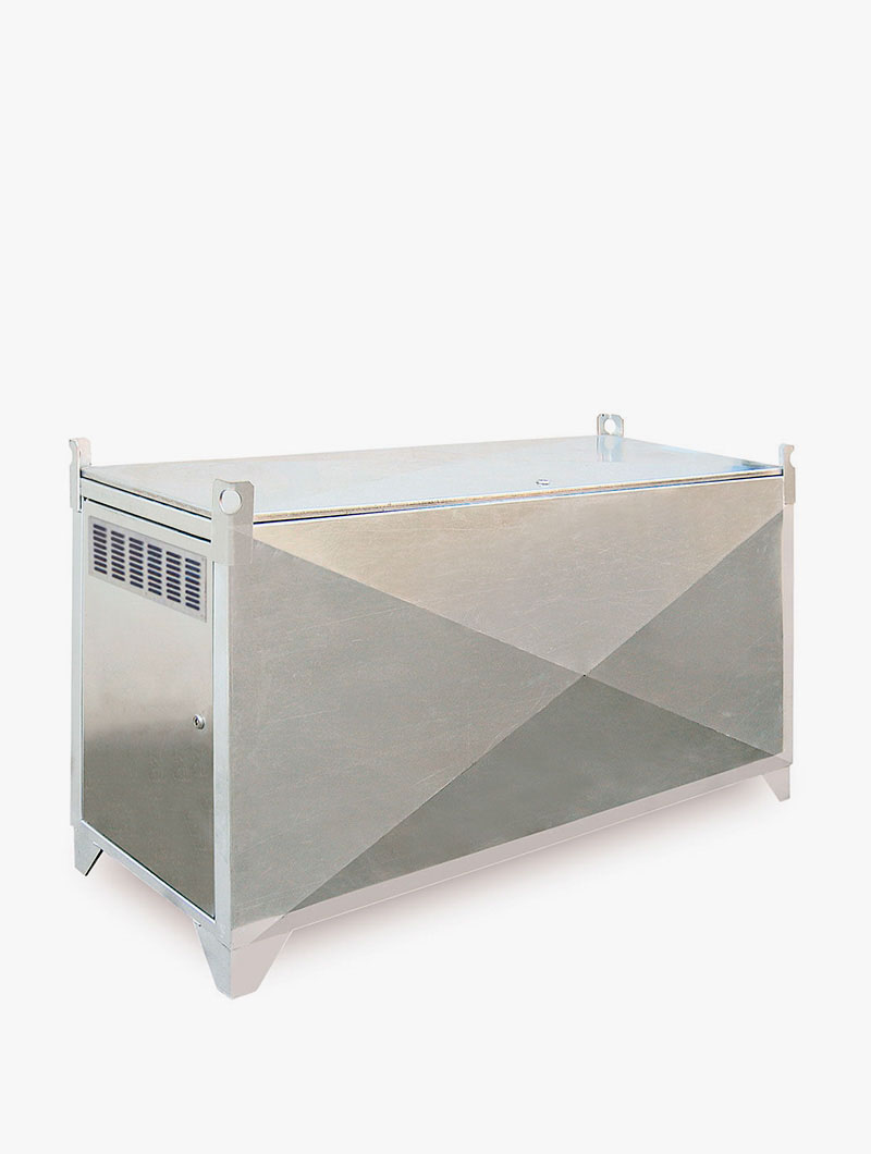 Fuerte estructura construida en chapa de acero galvanizado con patas de 100mm de altura para facilitar el uso y transporte con transpaleta o carretilla elevadora.