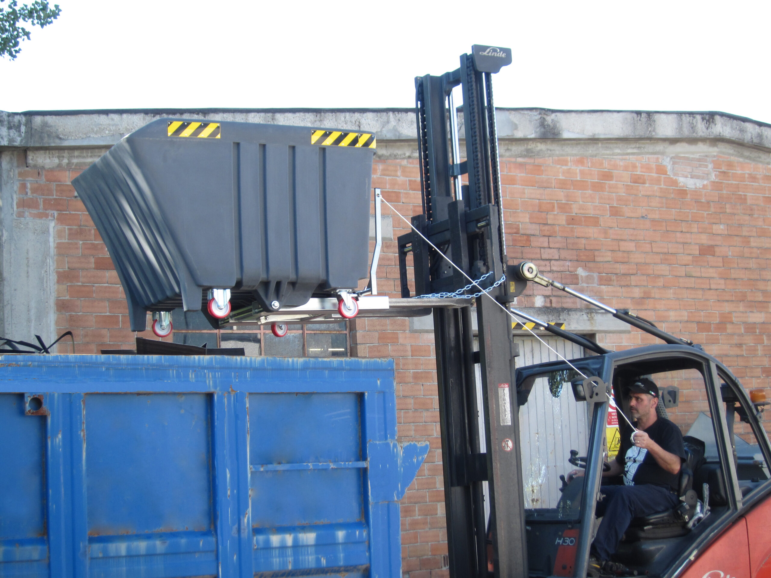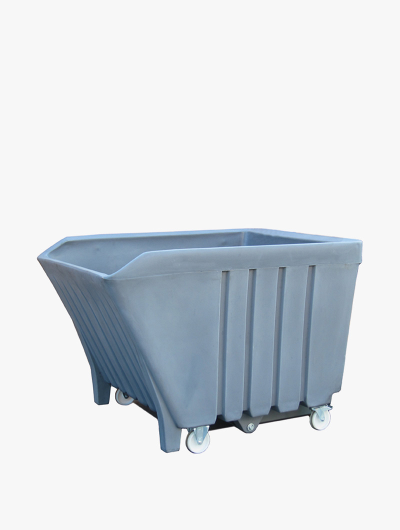 Contenedor de polietileno de alta resistencia. Dispone de tirador para su fácil transporte dentro de la fábrica por parte del operario.