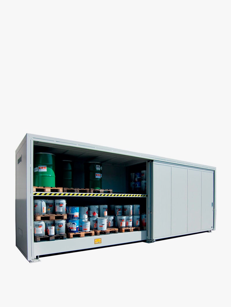 Sistema de almacenamiento práctico y accesible para líquidos potencialmente peligrosos. Ofrece una solución de bajo coste para el almacenamiento exterior de todo tipo de productos inflamables, explosivos o tóxicos.