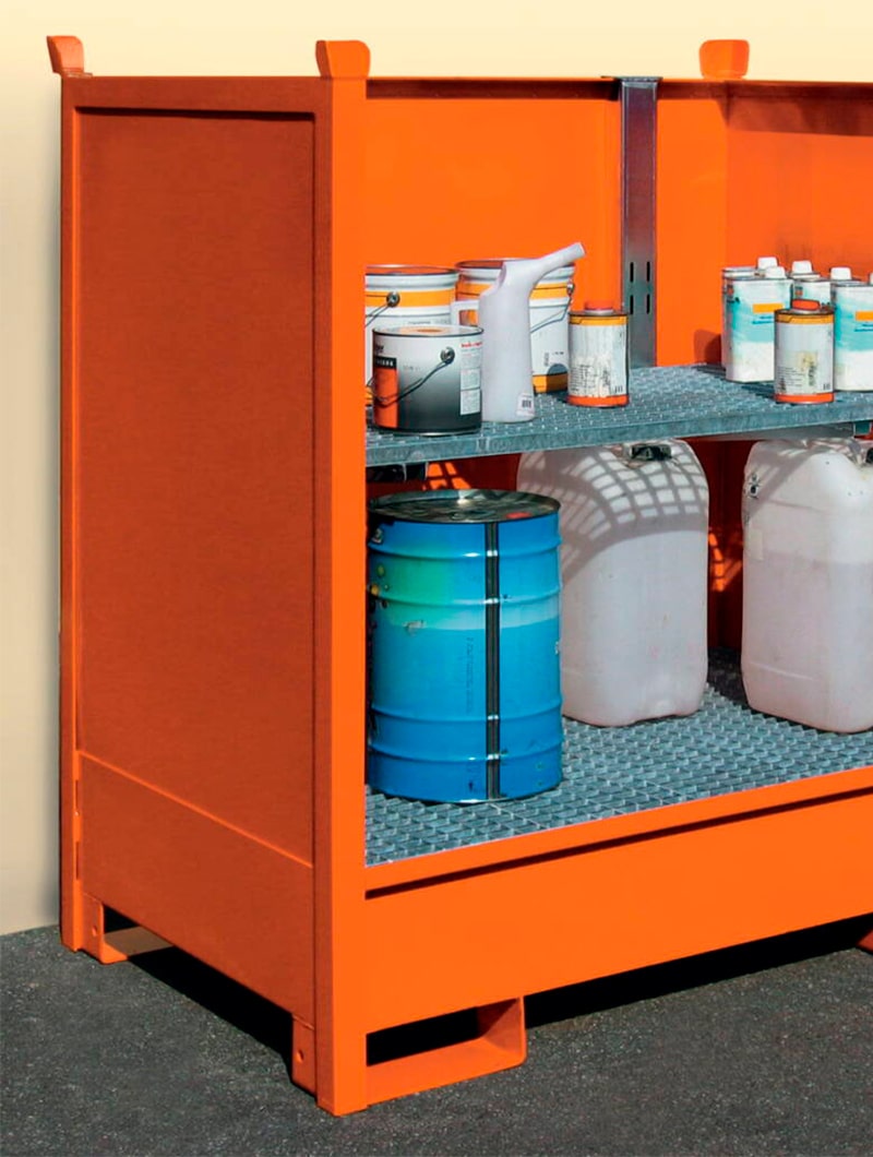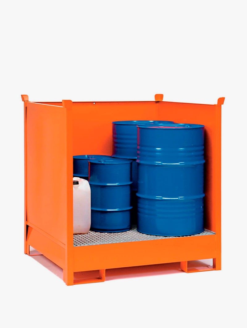Disponen en su base de un cubeto de retención para 210 litros con patas que permiten el manipulado con transpaleta o carretilla elevadora. La estructura fabricada en acero de alta resistencia permite el apilado. De esta manera permite el almacenamiento de grandes cantidades de productos peligrosos con una notable reducción del espacio.