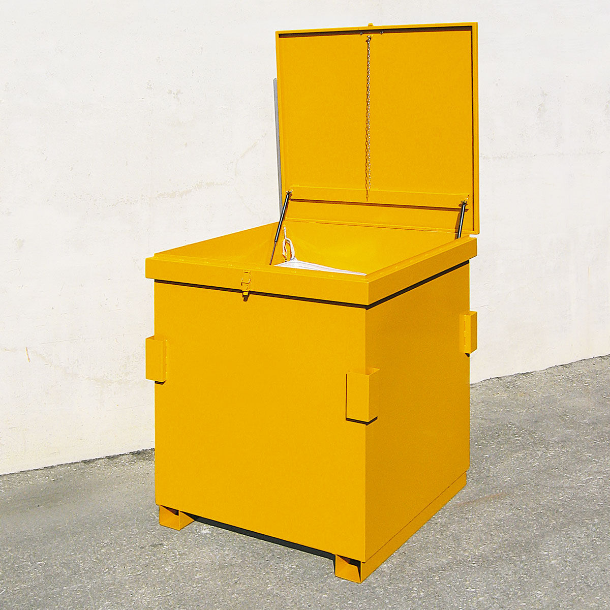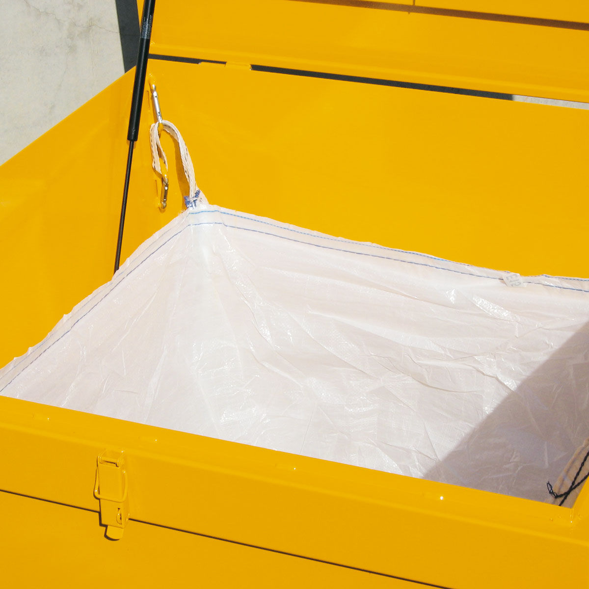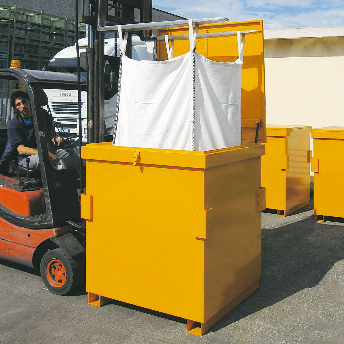 Depósito contenedor de seguridad para el almacenamiento de escombros y deshechos en bolsas Big Bag. Diseñado para colocar una bolsa flexible Big Bag de 1000 litros. Ideal para tener en cualquier obra o fábrica donde se generen cualquier tipo de escombros.
