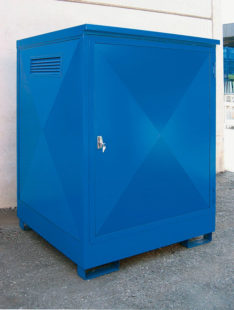 Dispone de puertas frontales con cerradura giratoria y las paredes laterales disponen de una rejilla 167 131 en la parte superior para garantizar una buena ventilación. De esta manera el depósito es apto para el almacenamiento de productos inflamables.