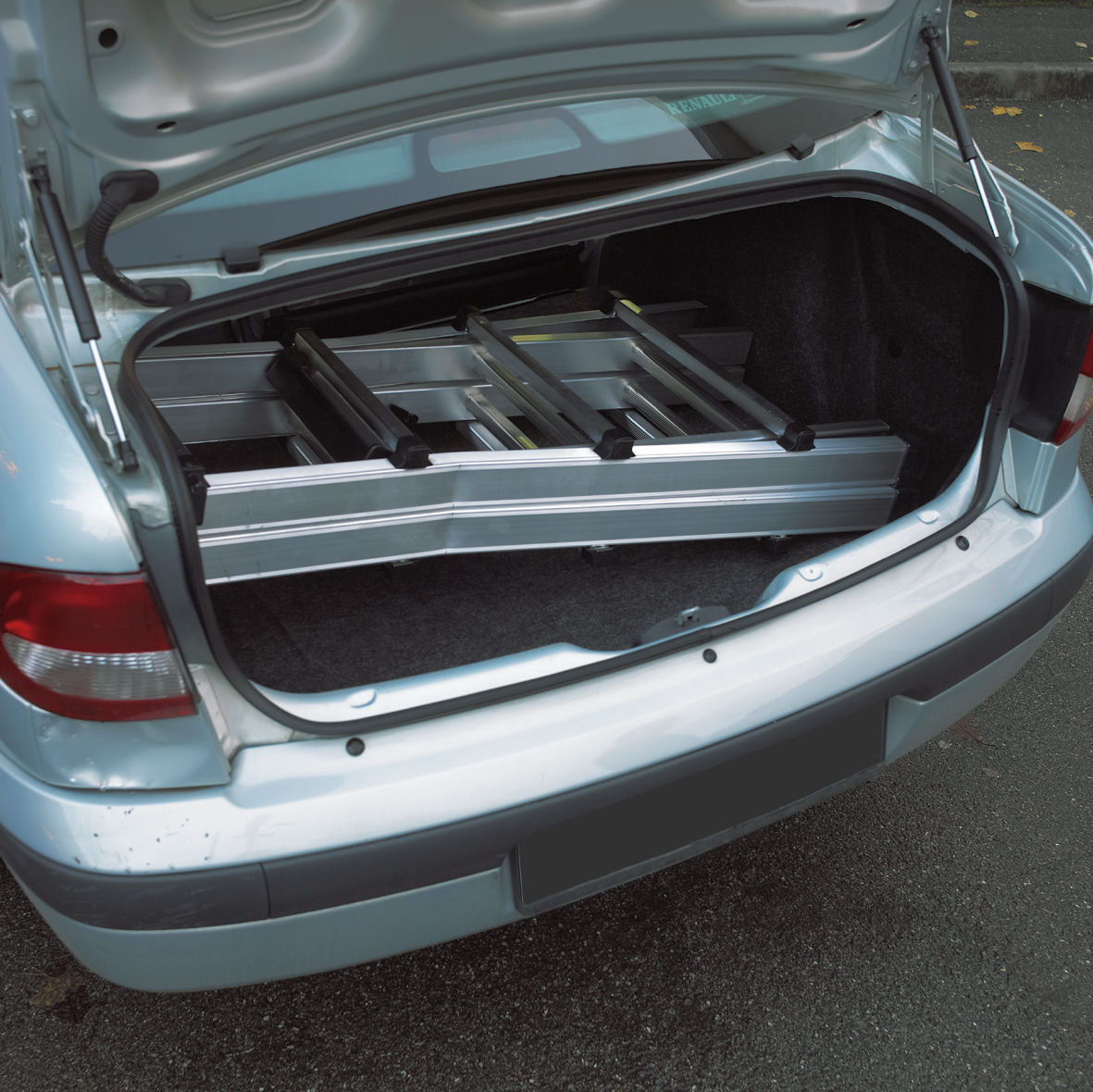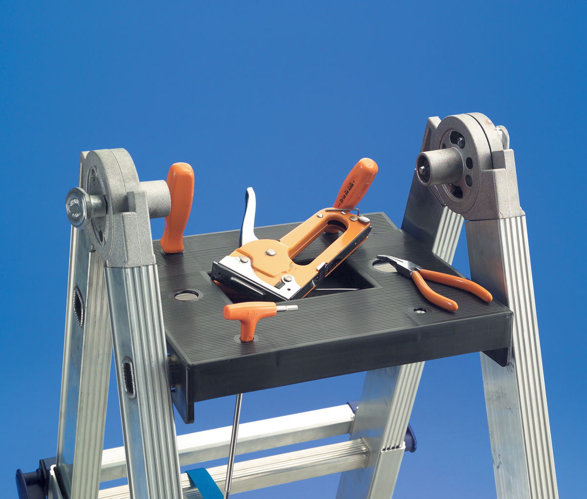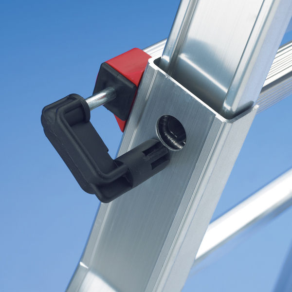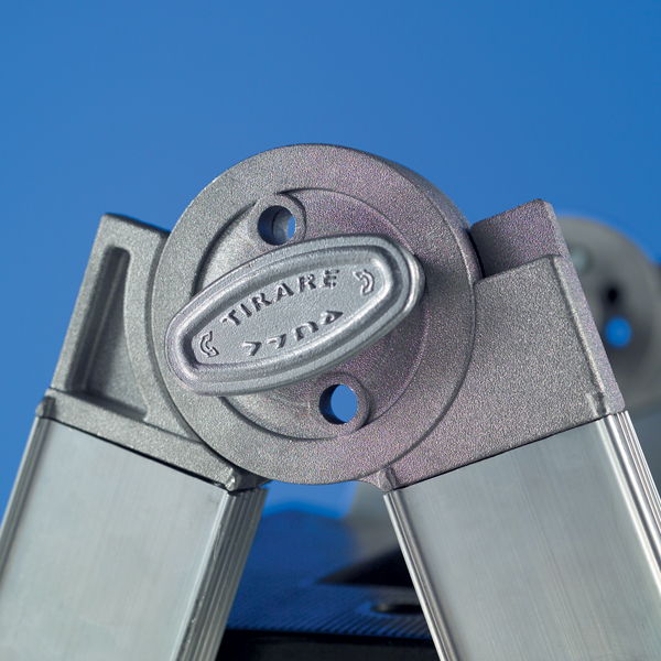 Escalera profesional ligera, resistente y plegable. Estructura formada a partir de perfiles de aluminio de 57x27mm (interno) y 64x30mm (externo). Dispone de mecanismo de bisagra de tres posiciones fabricado en aluminio que permite utilizar la escalera tanto en modo caballete como en muro.