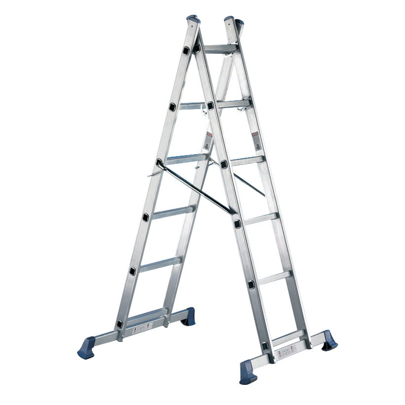 Escalera doméstica ligera y resistente convertible en andamio. Pensada para trabajar en posición caballete o en plataforma elevada. Fabricada a partir de perifles de aluminio ligero con estructura a base de escalones y montantes.
