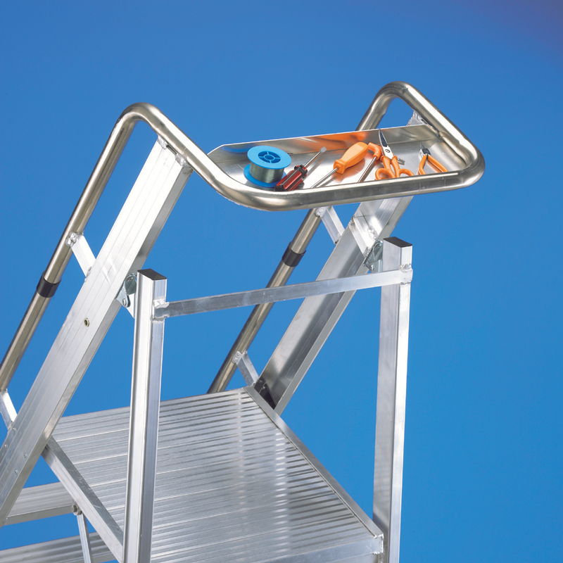 Dispone de barra estabilizadora en la base. Patas con tapones ergonómicos de plástico PVC que permiten el perfecto apoyo de la escalera en suelo sin peligro alguno de deslizamiento. Equipada con bandeja portaobjetos en la parte superior con capacidad para 15kg. Ancho de la escalera cerrada 300mm.