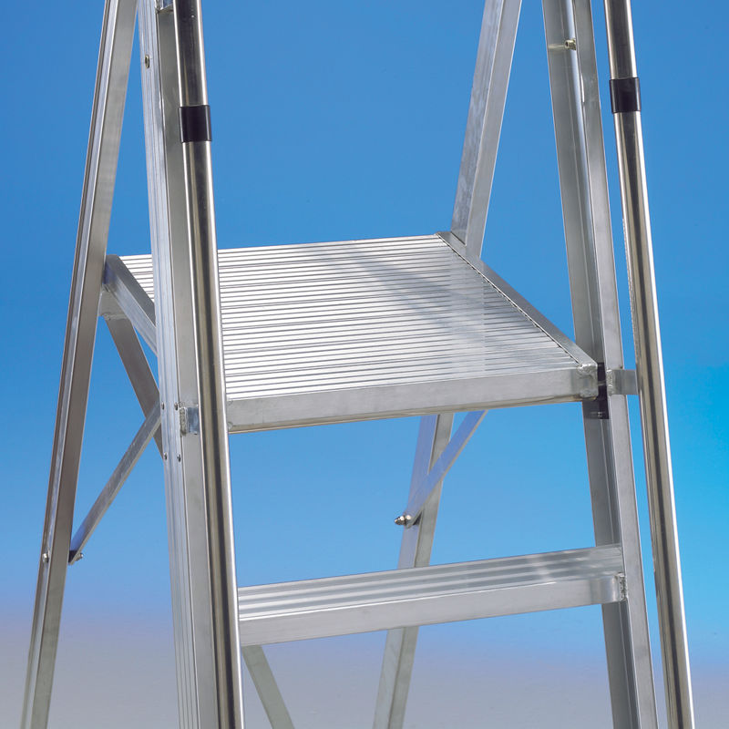 Escalera con plataforma Osa Menor ligera y resistente. Estructura formada a partir de perfiles de aluminio nervados y soldados. Pensada para trabajar en posición caballete. Estructura principal fabricada en perfil de 80x25mm y estructura de apoyo fabricada en perfil de 57x27mm. Dispone de plataforma de trabajo de 500x450mm con parapeto de 800mm de altura y con capacidad de carga de 150kg.