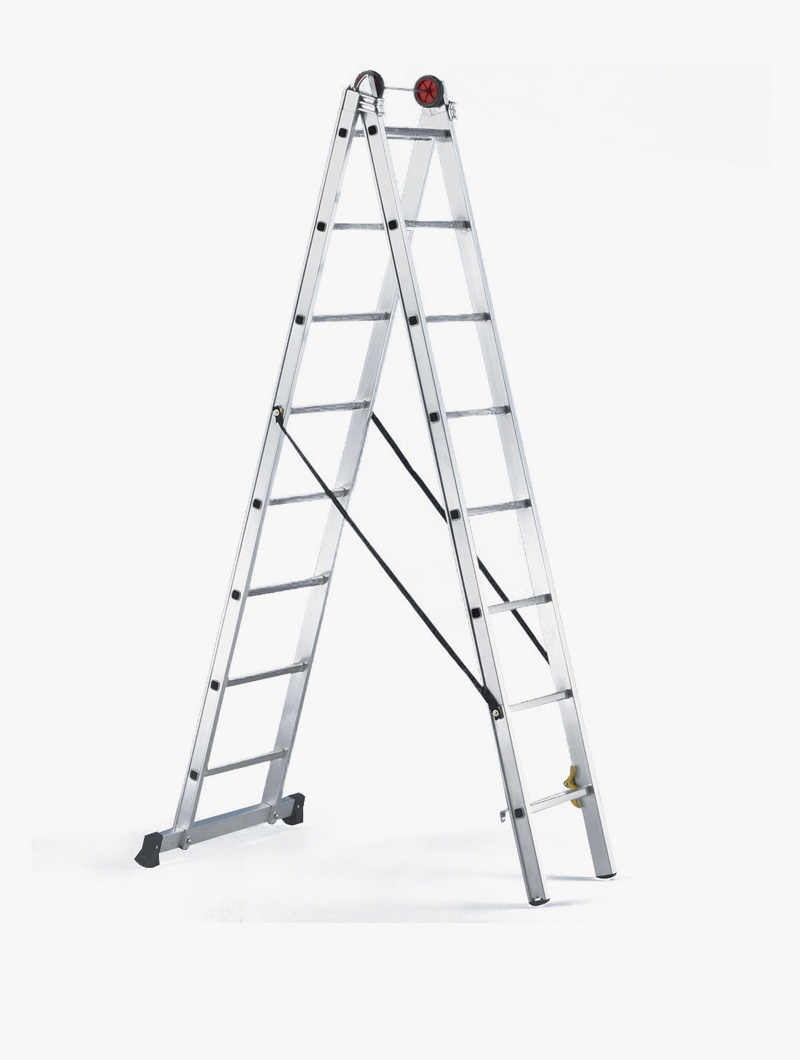 Escalera profesional ligera y resistente. Pensada para trabajar en posición caballete o vertical con apoyo a pared.