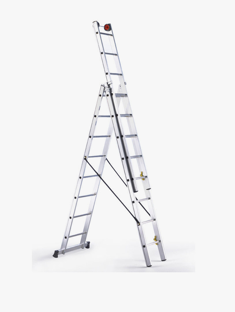 Escalera profesional ligera y resistente. Pensada para trabajar en posición caballete o vertical con apoyo a pared. En posición caballete, el tercer tronco puede funcionar a modo de parapeto.