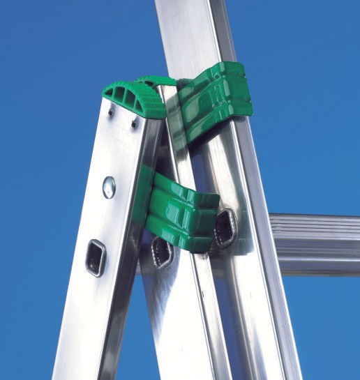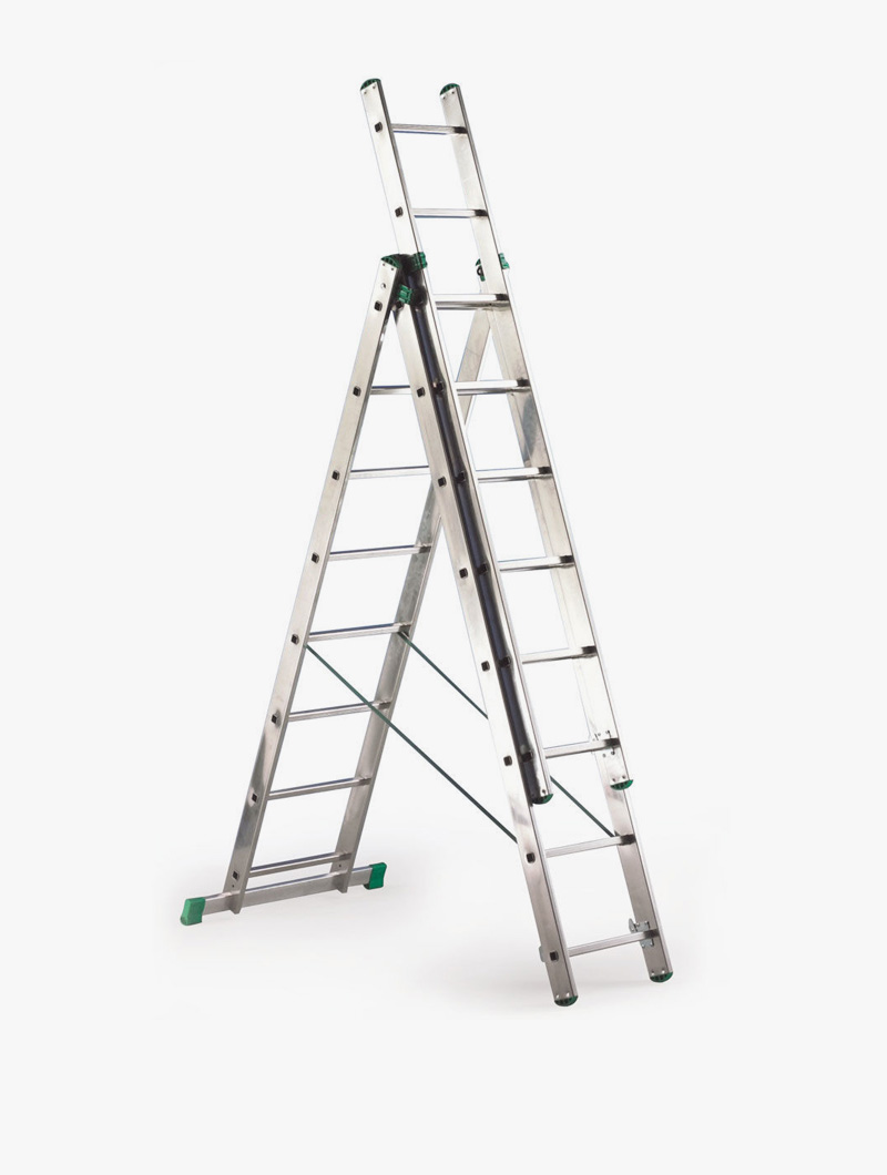 Escalera ligera y resistente. Pensada para trabajar en posición caballete o vertical con apoyo a pared. En posición caballete, el tercer tronco puede funcionar a modo de parapeto.