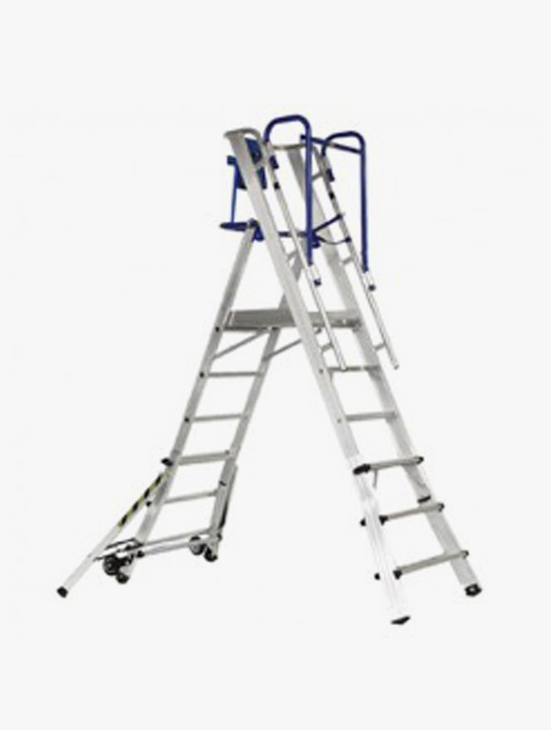 Plataforma de aluminio antideslizante reforzada (60 × 53 cm) con sistema de anti-apertura accidental.