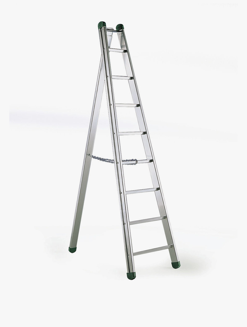 Fabricada a partir de perifles de aluminio ligero con estructura a base de peldaños y montantes. Dispone de un mástil auxiliar que permite usar la escalera tanto apoyada a pared como en tipo cavallete. Los escalones están montados en el montante mediante tornillos de sujeción y conforman una estructura robusta, estable y duradera. Distancia entre escalones de 250mm. Disponible en varias alturas, desde 8 hasta 14 peldaños. El último escalón está reforzado.