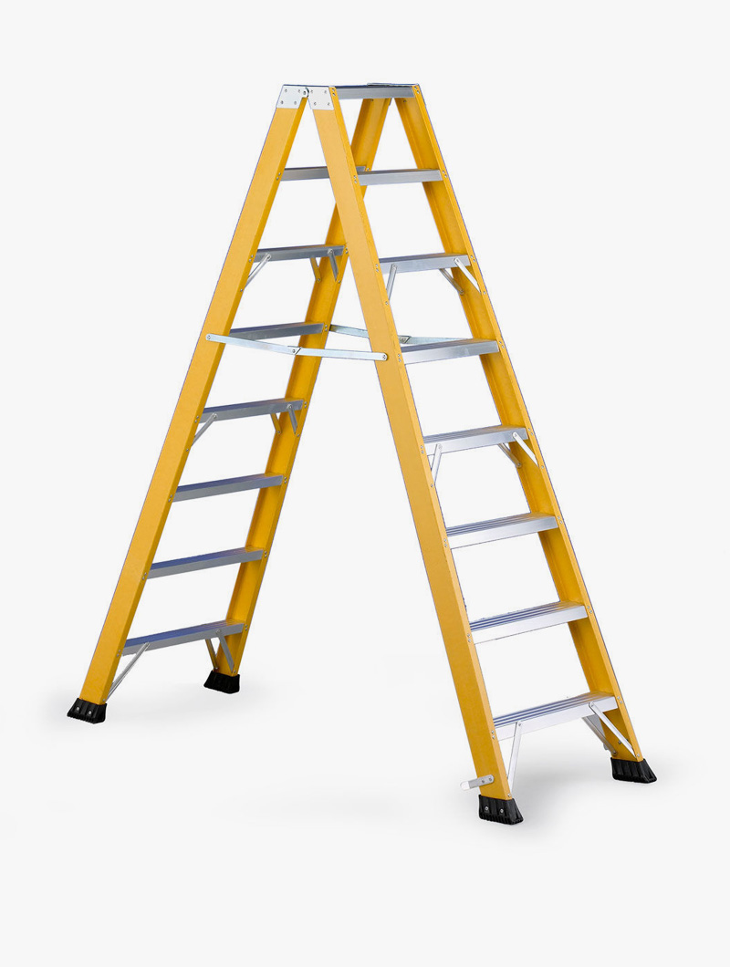 Escalera profesional ligera y resistente diseñada para trabajar a caballete. Estructura plegable fabricada a base de vetroresina y aluminio. Especialmente pensada para electricistas. Sistema de seguridad mediante cincha que evita la apertura accidental de la escalera. Dispone de escalones de 80mm de fondo i montante de dimensiones 82x30mm. Patas con tapones de plástico PVC antideslizantes que proporcionan una gran estabilidad.