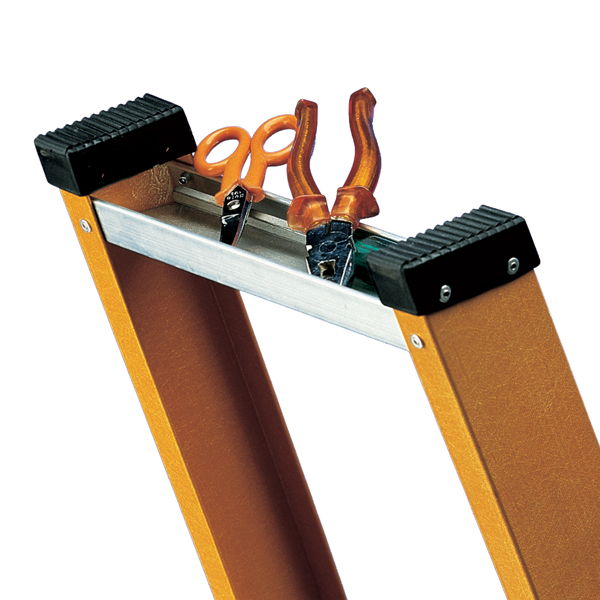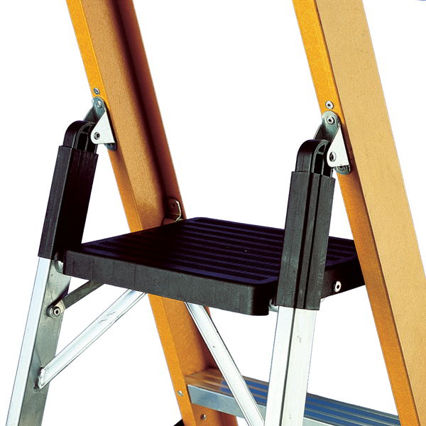 Escalera profesional ligera y resistente. Estructura plegable fabricada a base de vetroresina y aluminio. Especialmente pensada para electricistas. Diseñada para trabajar a caballete. Dispone de parapeto de 600mm de altura para mejorar la seguridad a la hora de realizar los trabajos en altura. Doble sistema de seguridad con plataforma autoblocante de 255x280mm fabricada en polipropileno reforzado y aislante, y zincha de seguridad. Dispone de barra estabilizadora en la base.