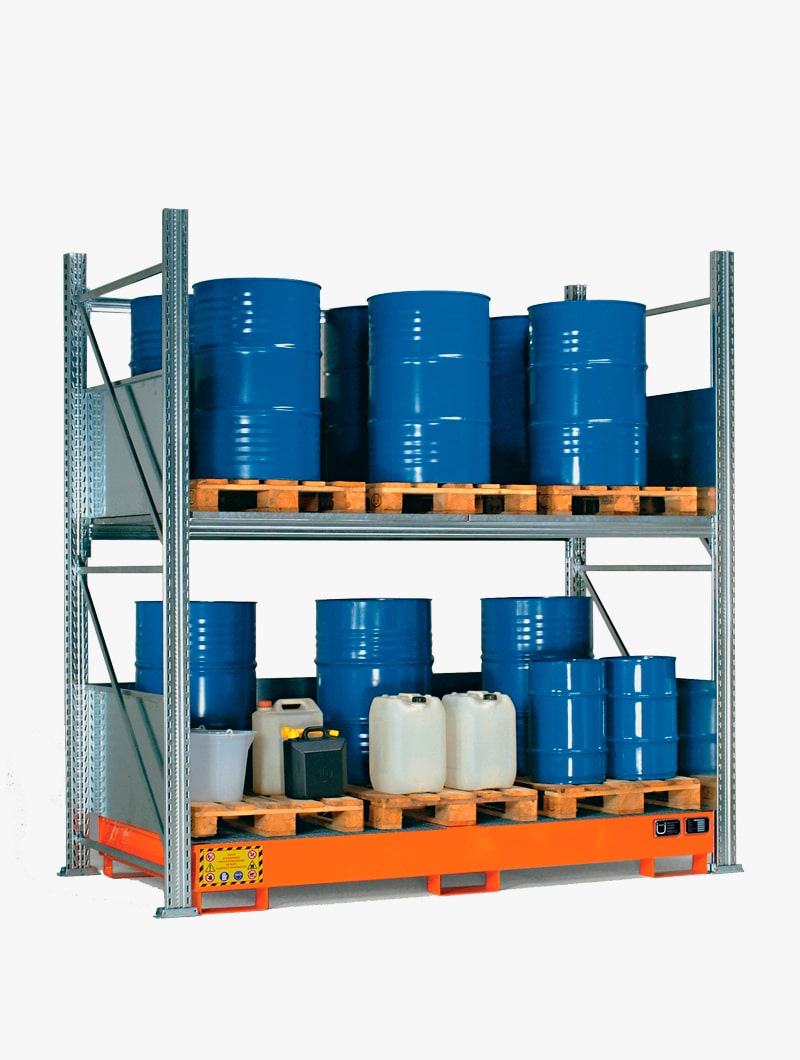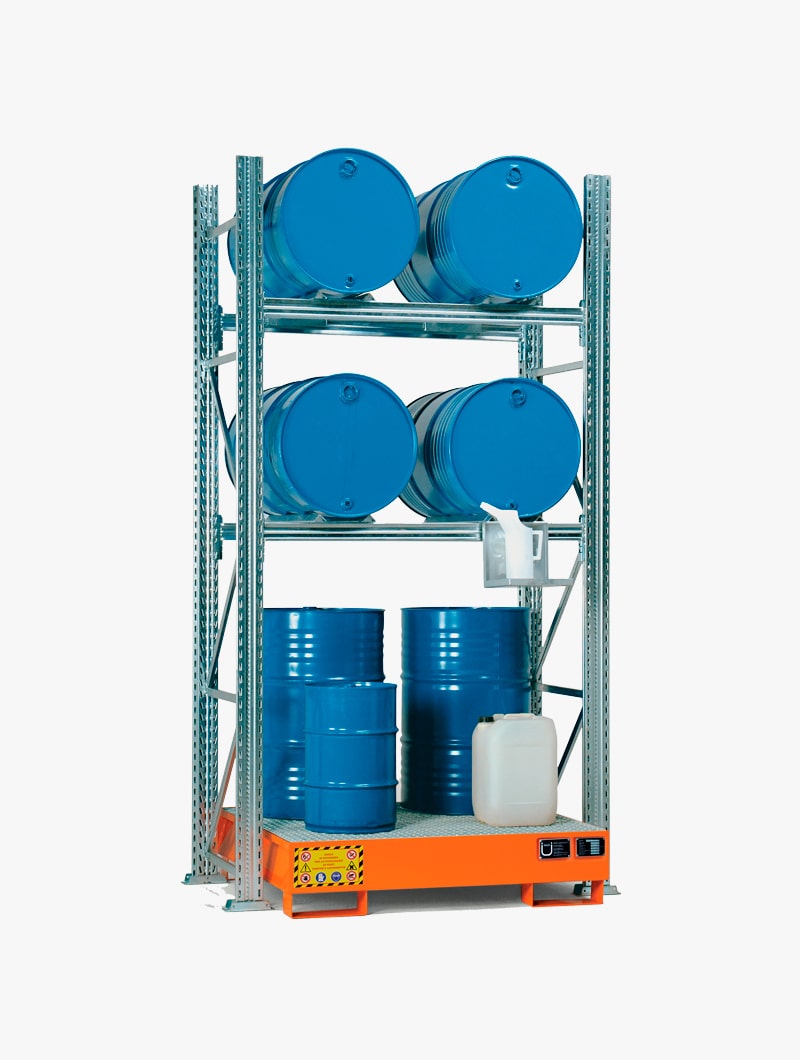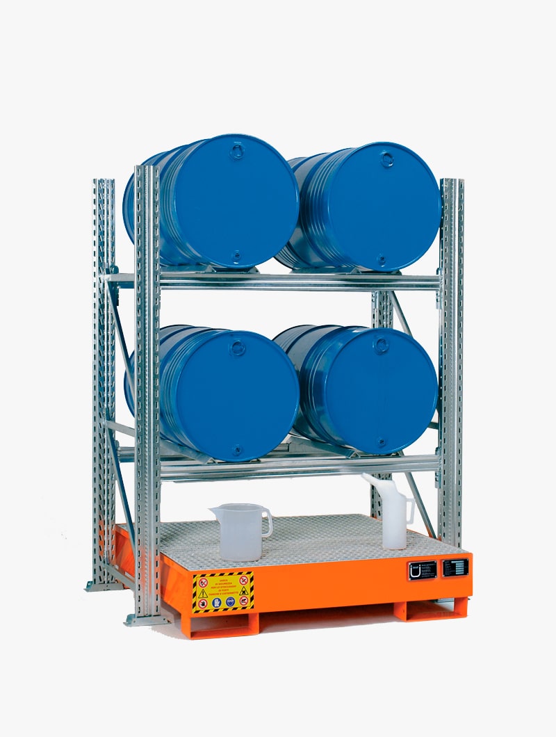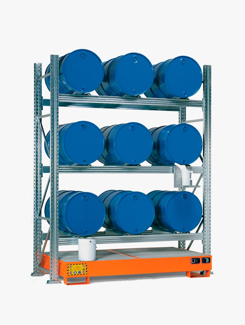 Estanterías para el almacenamiento interior de bidones de 60 lts y 200 lts. para sustancias contaminantes, tóxicas e inflamables. Estructura estable y fácil de montar formada por un módulo inicial más los módulos adicionales que se necesiten. Se fija al suelo. Equipados con cubeta colectora en chapa de acero galvanizado de 3mm de espesor. Cubetas galvanizadas, pintadas o en polietileno; para el almacenamiento de corrosivos. Travesaños de carga regulables en altura, con capacidad de 3.000 kg de carga. La capacidad de retención de los cubetos varía en función de la cantidad de barriles. Se suministran desmontadas para reducir al máximo los costes del transporte. Fácil montaje.