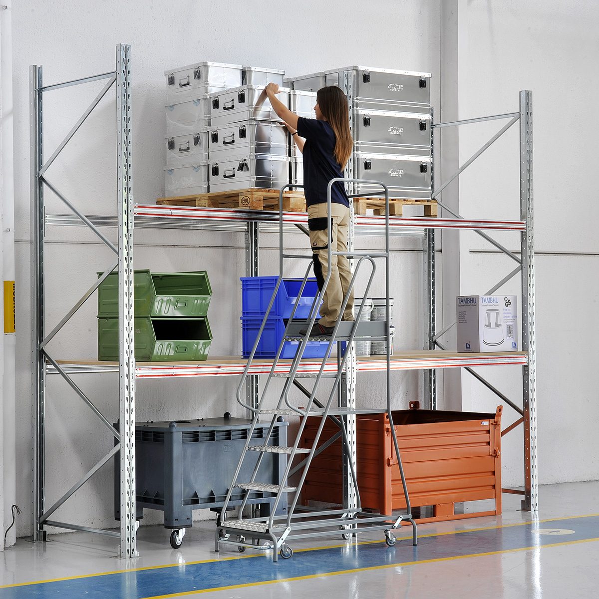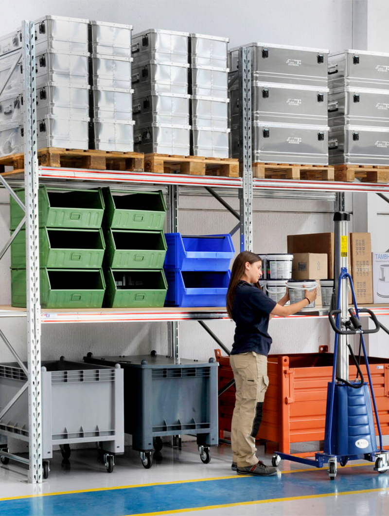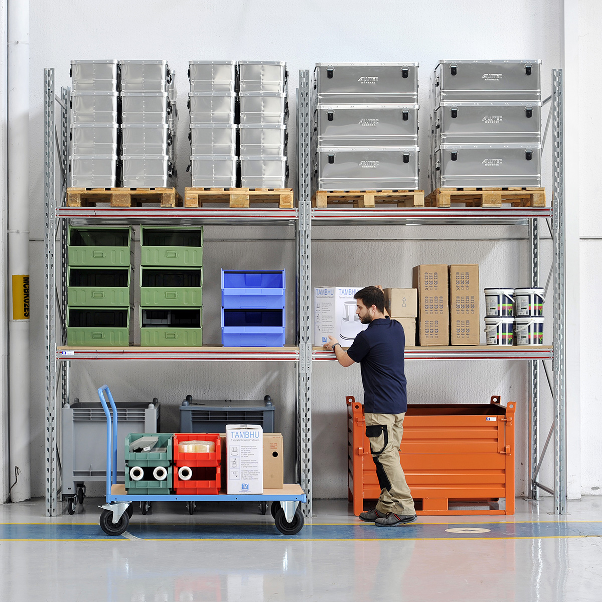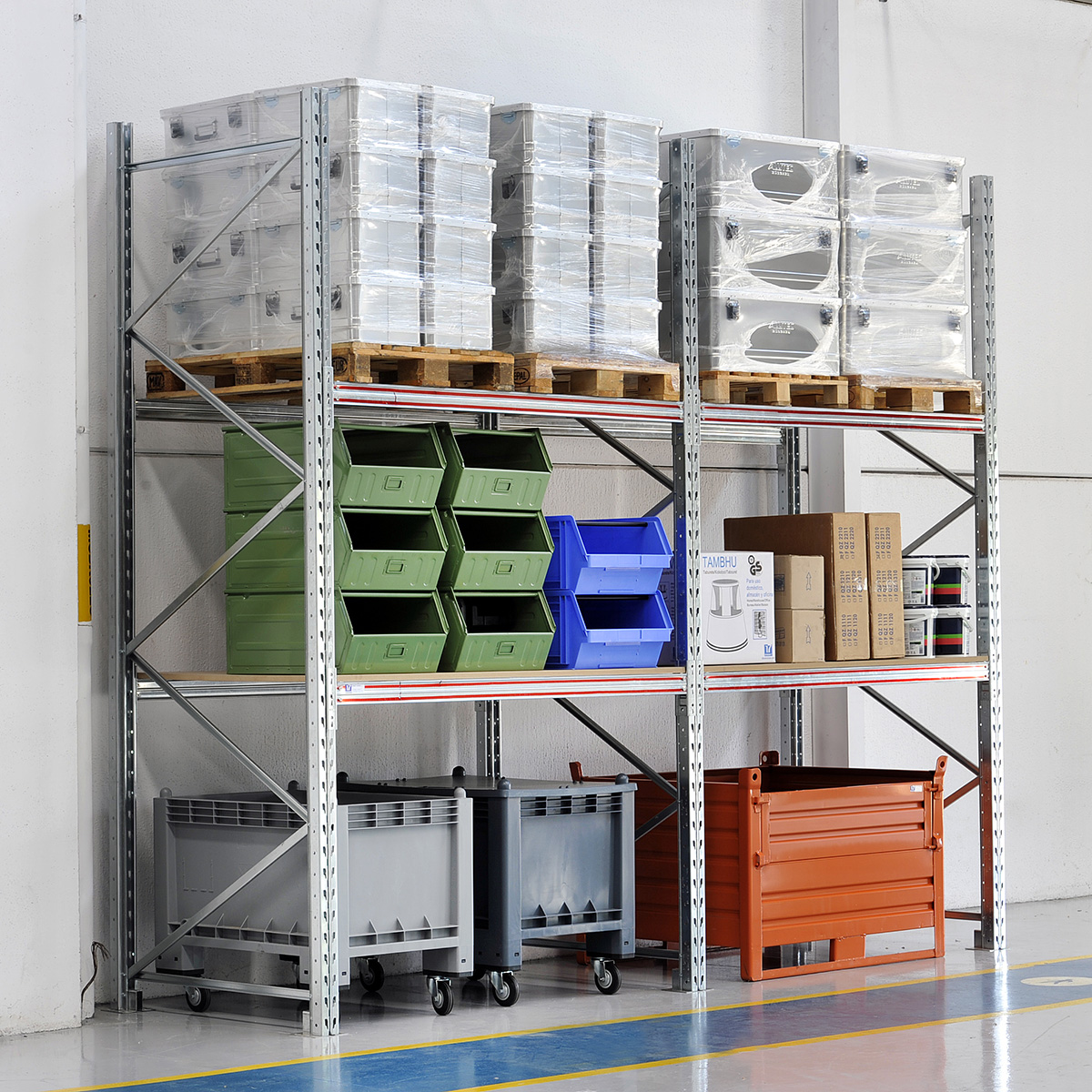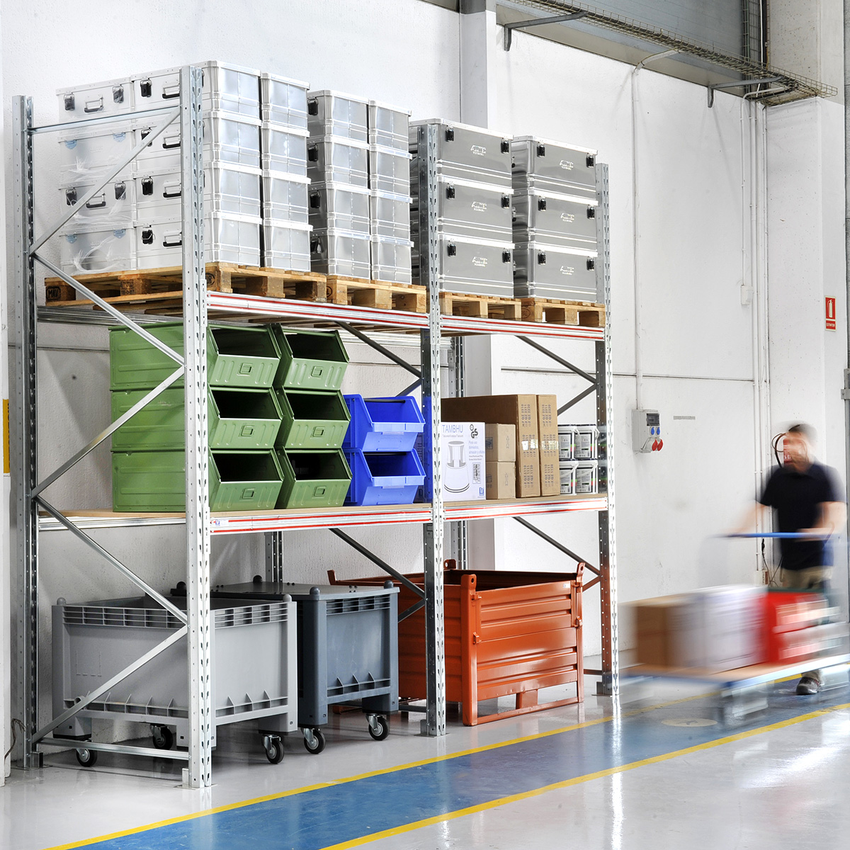 Las estanterías de paletización disponen de un sistema flexible para la configuración de los estantes de capacidad media, contenedores o unidades sueltas de carga hasta 6,5 toneladas por estribo y 800 kg por nivel (carga uniforme).