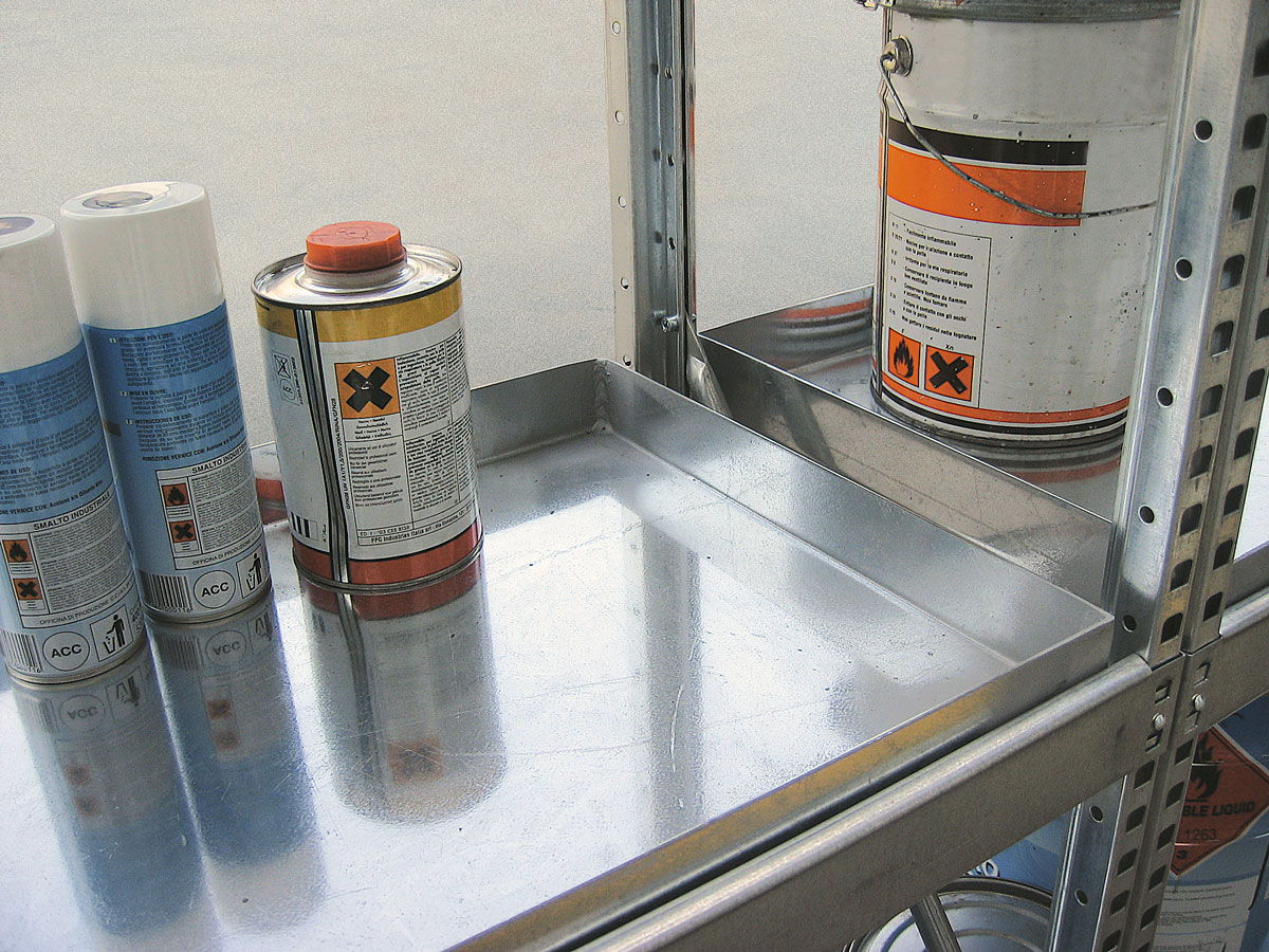 En caso de almacenar sustancias inflamables, los estantes deben ser rejados y el cubeto de retención se sitúa en la base.