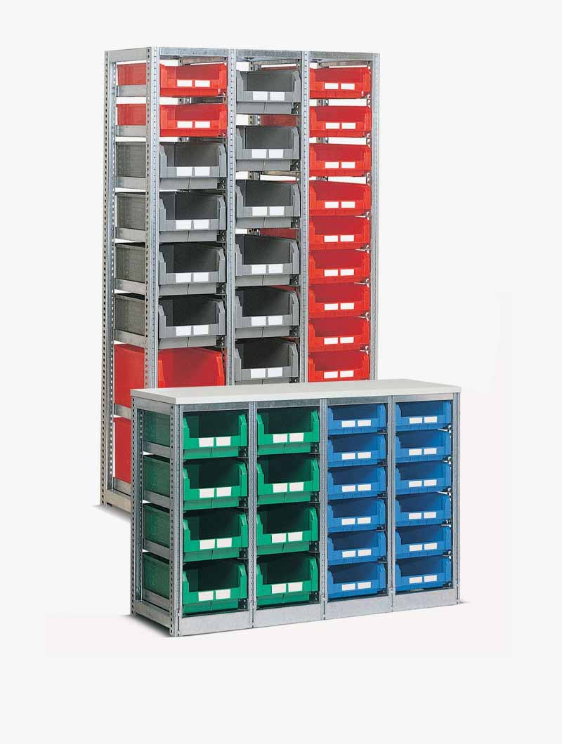 Disponemos de una amplia gama de medidas de estanterías metálicas pintadas o galvanizadas ideales para almacenar cajas de plástico.