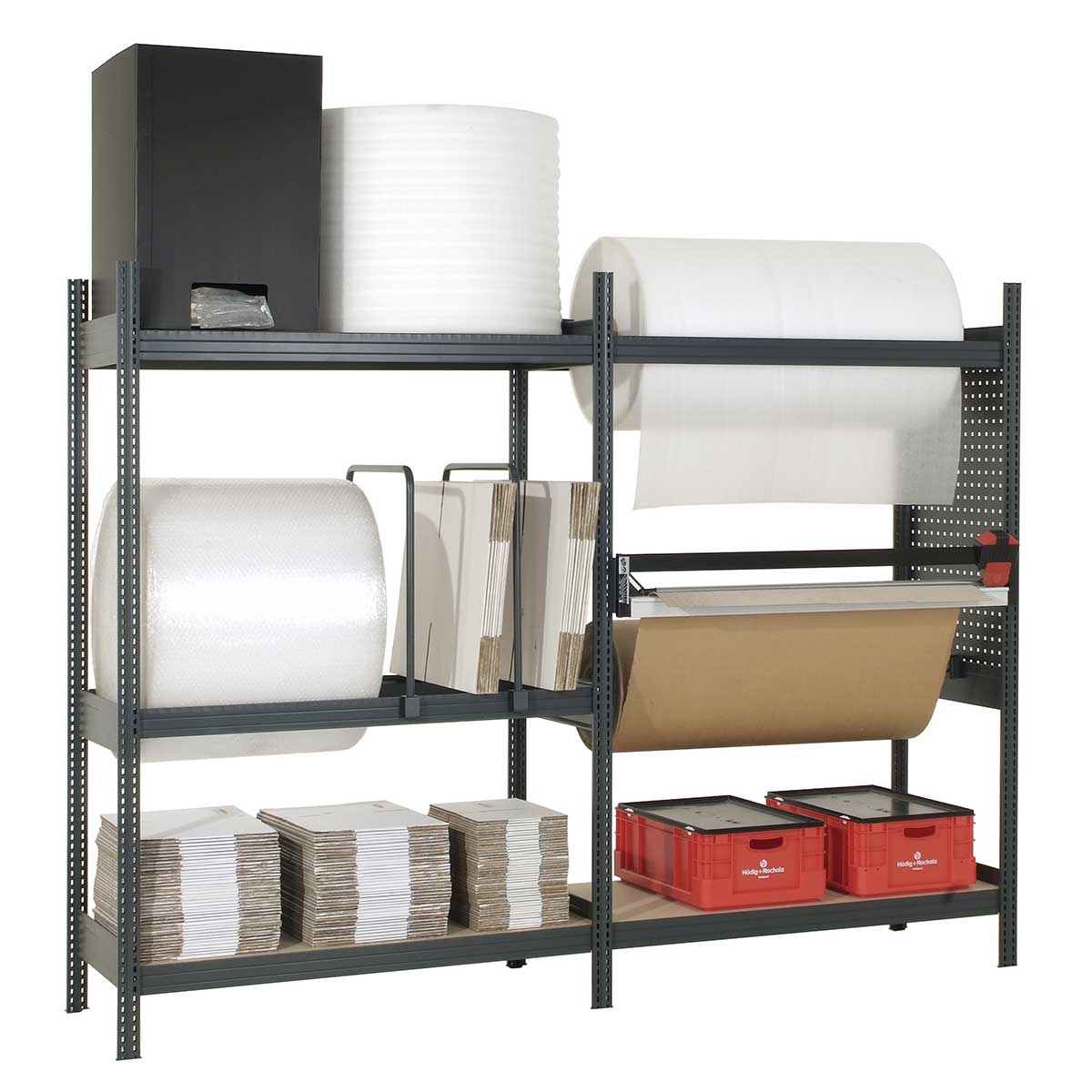 Estanterías con sistemas de almacenamiento para rollos y cajas de cartón para preparación de pedidos y embalaje. Totalmente confiurables con separadores de cajas, largueros para rollos, estantes de madera, paneles perforados, etc. Ideal para configurar espacios de trabajo de embalaje.
