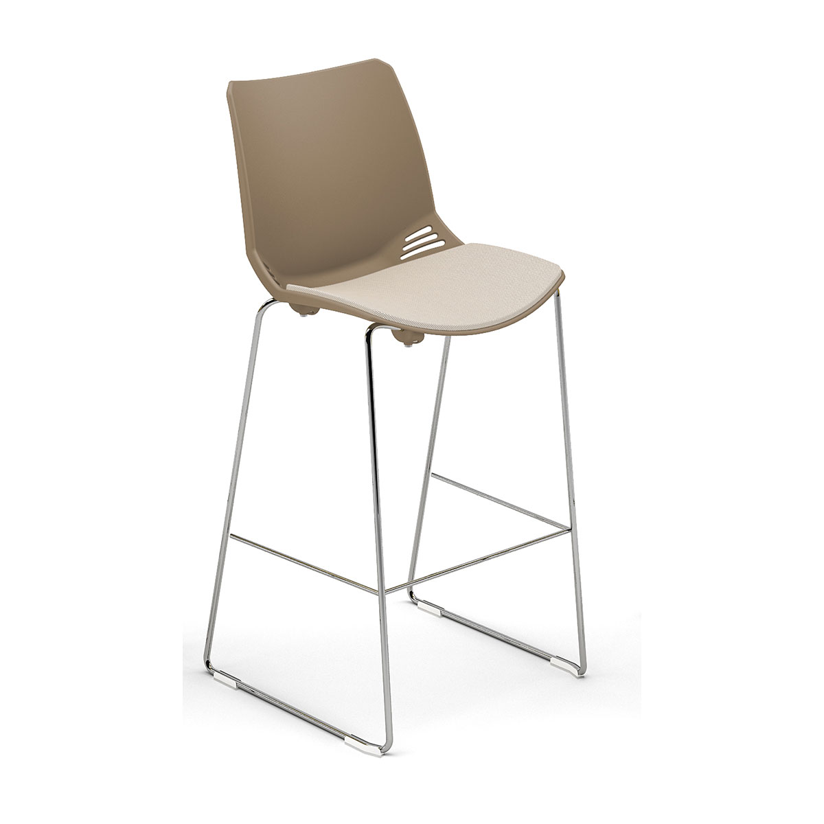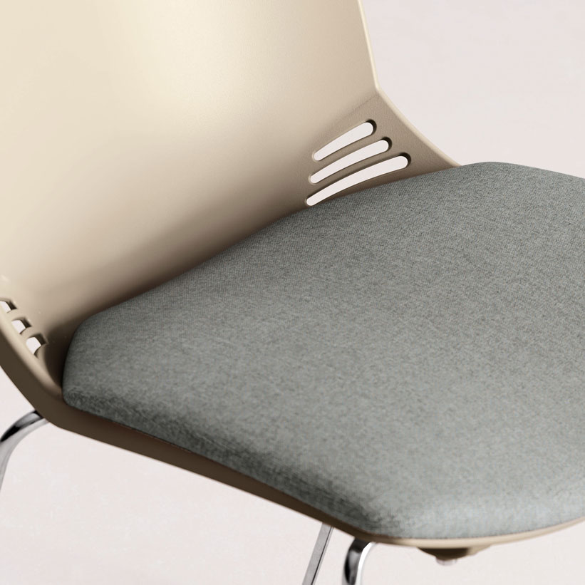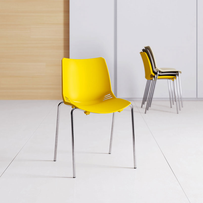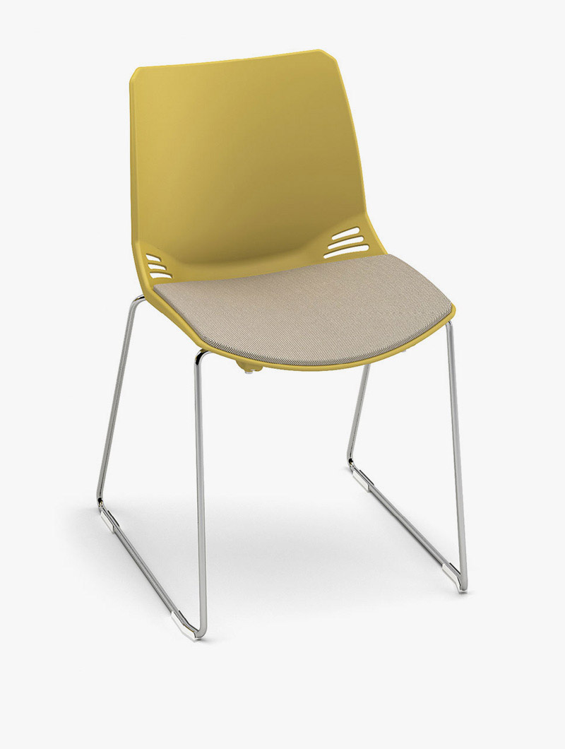 Una estructura de un solo bastidor, apta para ser utilizada en cualquier contexto y entorno. Disponible en las versiones de silla y taburete, con armazón de cuatro patas o enrasado, que soporta carcasas de polipropileno en tres colores. El cojín acolchado mejora la imagen y la funcionalidad.