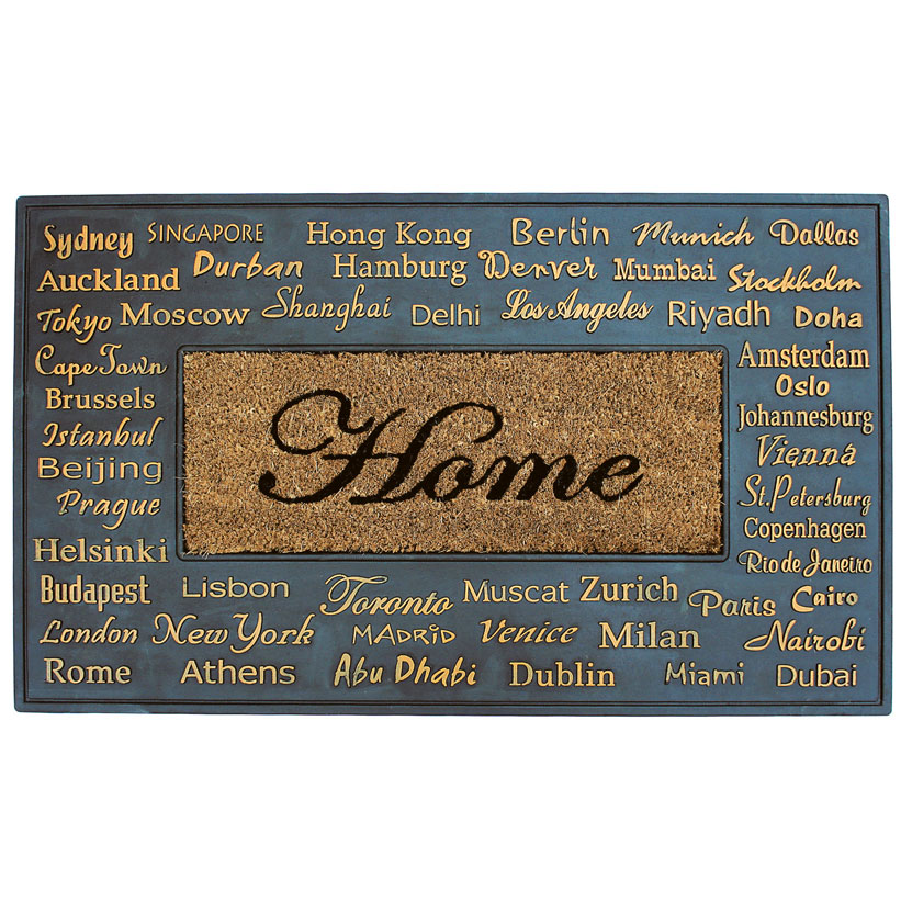 Felpudo de fibra de coco con base de caucho rectangular con nombres de ciudades grabadas en la parte superior.